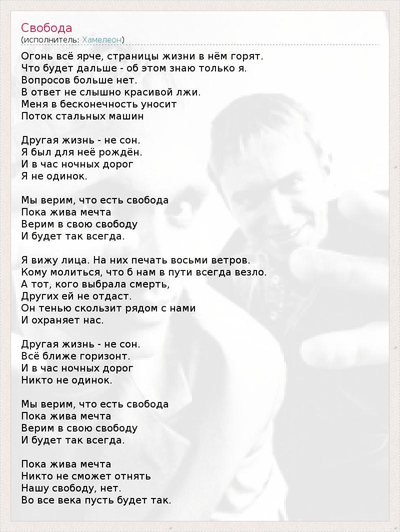 Огонь всё ярче, страницы жизни в нём горят. Что будет дальше - об этом знаю только я. Вопросов больше нет. В ответ не слышно красивой лжи. Меня в бесконечность уносит Поток стальных машин Другая жизнь - не сон. Я был для неё рождён. И в час ночных дорог Я не одинок. Мы верим, что есть свобода Пока жива мечта Верим в свою свободу И будет так всегда. Я вижу лица. На них печать восьми ветров. Кому молиться, что б нам в пути всегда везло. А тот, кого выбрала смерть, Других ей не отдаст. Он тенью скользит рядом с нами И охраняет нас. Другая жизнь - не сон. Всё ближе горизонт. И в час ночных дорог Никто не одинок. Мы верим, что есть свобода Пока жива мечта Верим в свою свободу И будет так всегда. Пока жива мечта Никто не сможет отнять Нашу свободу, нет. Во все века пусть будет так.