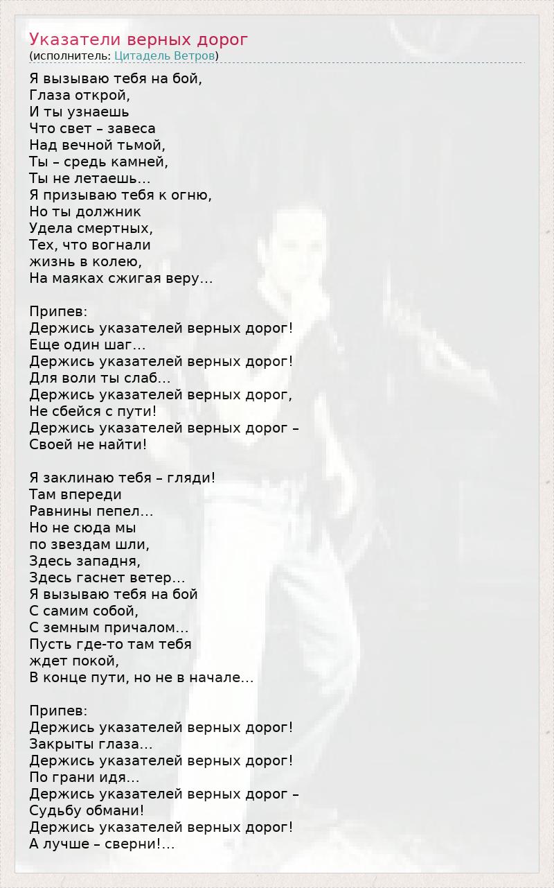 Я вызываю тебя на бой, Глаза открой, И ты узнаешь Что свет – завеса Над вечной тьмой, Ты – средь камней, Ты не летаешь… Я призываю тебя к огню, Но ты должник Удела смертных, Тех, что вогнали жизнь в колею, На маяках сжигая веру… Припев: Держись указателей верных дорог! Еще один шаг… Держись указателей верных дорог! Для воли ты слаб… Держись указателей верных дорог, Не сбейся с пути! Держись указателей верных дорог – Своей не найти! Я заклинаю тебя – гляди! Там впереди Равнины пепел… Но не сюда мы по звездам шли, Здесь западня, Здесь гаснет ветер… Я вызываю тебя на бой С самим собой, С земным причалом… Пусть где-то там тебя ждет покой, В конце пути, но не в начале… Припев: Держись указателей верных дорог! Закрыты глаза… Держись указателей верных дорог! По грани идя… Держись указателей верных дорог – Судьбу обмани! Держись указателей верных дорог! А лучше – сверни!…