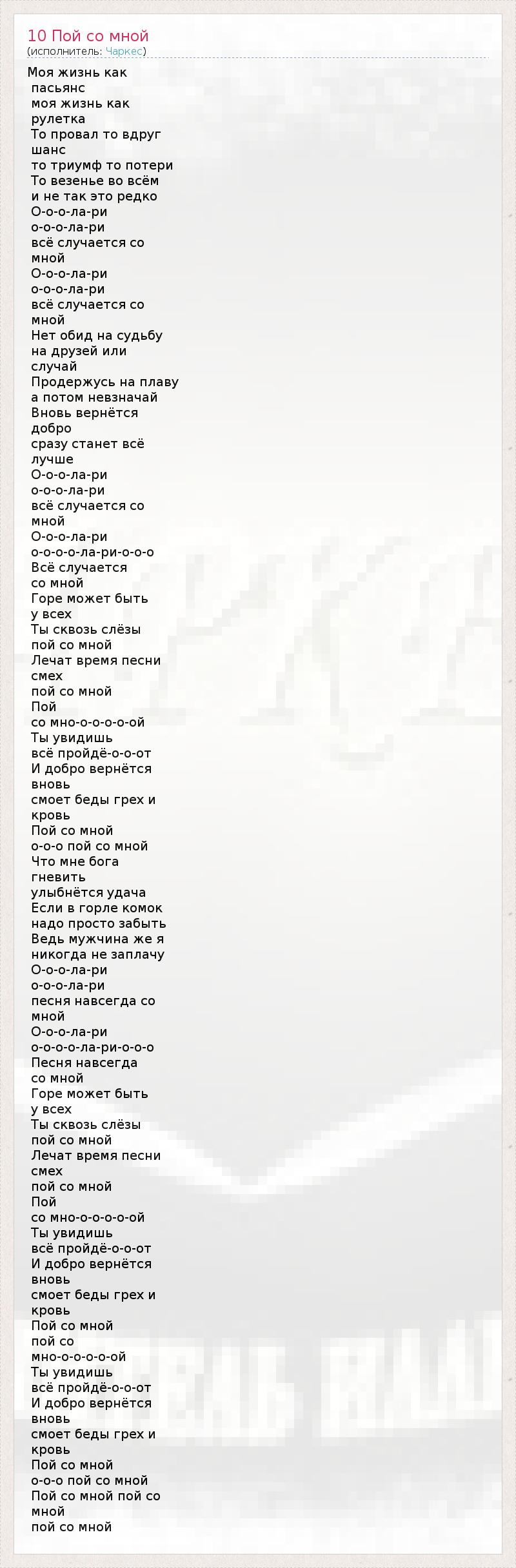 Моя жизнь как пасьянс моя жизнь как рулетка То провал то вдруг шанс то триумф то потери То везенье во всём и не так это редко О-о-о-ла-ри о-о-о-ла-ри всё случается со мной О-о-о-ла-ри о-о-о-ла-ри всё случается со мной Нет обид на судьбу на друзей или случай Продержусь на плаву а потом невзначай Вновь вернётся добро сразу станет всё лучше О-о-о-ла-ри о-о-о-ла-ри всё случается со мной О-о-о-ла-ри о-о-о-о-ла-ри-о-о-о Всё случается со мной Горе может быть у всех Ты сквозь слёзы пой со мной Лечат время песни смех пой со мной Пой со мно-о-о-о-о-ой Ты увидишь всё пройдё-о-о-от И добро вернётся вновь смоет беды грех и кровь Пой со мной о-о-о пой со мной Что мне бога гневить улыбнётся удача Если в горле комок надо просто забыть Ведь мужчина же я никогда не заплачу О-о-о-ла-ри о-о-о-ла-ри песня навсегда со мной О-о-о-ла-ри о-о-о-о-ла-ри-о-о-о Песня навсегда со мной Горе может быть у всех Ты сквозь слёзы пой со мной Лечат время песни смех пой со мной Пой со мно-о-о-о-о-ой Ты увидишь всё пройдё-о-о-от И добро вернётся вновь смоет беды грех и кровь Пой со мной пой со мно-о-о-о-о-ой Ты увидишь всё пройдё-о-о-от И добро вернётся вновь смоет беды грех и кровь Пой со мной о-о-о пой со мной Пой со мной пой со мной пой со мной
