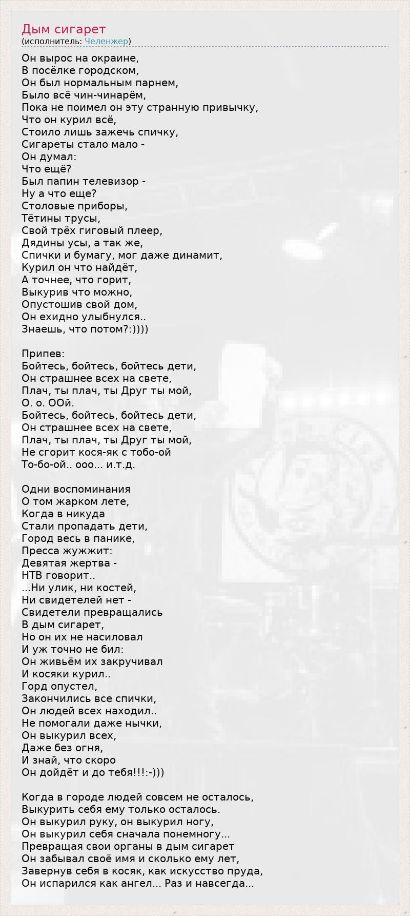 He grew up in the suburbs, In the settlement of the city , He was a normal guy , It was all the rank - chinarёm , Until he raped this strange habit , That he had smoked all Had only to light a match , Cigarettes became a little - He thought : What else? Was my father's TV - Well, what else? Cutlery, Aunt's pants His three gigs player Uncle's mustache, as well as , Matches and paper , could not even dynamite He smoked that will, Or rather , that burns , That can be smoked , Emptying his house , He smiled slyly .. You know, what then? :)))) Chorus: Afraid, afraid, afraid of the children , He is worse than anyone in the world , Crying, you cry , you 're my friend , Od . Ooi . Afraid, afraid, afraid of the children , He is worse than anyone in the world , Crying, you cry , you 're my friend , Do not burn mowing - yak with Tobo th Then -bo - oh .. ohh ... etc. only memories On that hot summer , When nowhere Children began to disappear , The city all in a panic , Press buzzing : Nine of the victims - NTV said .. ... No evidence , no bones, Neither there are no witnesses - witnesses turned In cigarette smoke, But he did not rape And I certainly did not beat : He twisted them alive And shoals of smoking .. Gord was empty, Ended all matches He found all the people .. Did not help even nychki , He smoked all Even without the fire, And know that soon He reaches up and you !!! :- ))) When the men of the city is not left , Smoke myself to him just left. He smoked his hand , he smoked leg He smoked a little at first ... Turning their bodies in cigarette smoke He forgot his name and how old he is , Wrapped himself in a joint, as the art of the pond , He vanished like an angel ... Once and for all ...