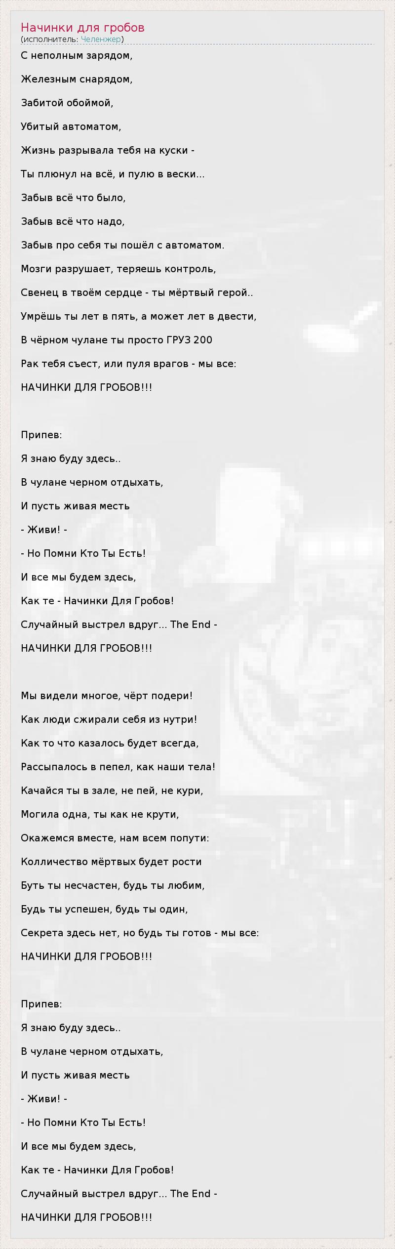 С неполным зарядом, Железным снарядом, Забитой обоймой, Убитый автоматом, Жизнь разрывала тебя на куски - Ты плюнул на всё, и пулю в вески... Забыв всё что было, Забыв всё что надо, Забыв про себя ты пошёл с автоматом. Мозги разрушает, теряешь контроль, Свенец в твоём сердце - ты мёртвый герой.. Умрёшь ты лет в пять, а может лет в двести, В чёрном чулане ты просто ГРУЗ 200 Рак тебя съест, или пуля врагов - мы все: НАЧИНКИ ДЛЯ ГРОБОВ!!! Припев: Я знаю буду здесь.. В чулане черном отдыхать, И пусть живая месть - Живи! - - Но Помни Кто Ты Есть! И все мы будем здесь, Как те - Начинки Для Гробов! Случайный выстрел вдруг... The End - НАЧИНКИ ДЛЯ ГРОБОВ!!! Мы видели многое, чёрт подери! Как люди сжирали себя из нутри! Как то что казалось будет всегда, Рассыпалось в пепел, как наши тела! Качайся ты в зале, не пей, не кури, Могила одна, ты как не крути, Окажемся вместе, нам всем попути: Колличество мёртвых будет рости Буть ты несчастен, будь ты любим, Будь ты успешен, будь ты один, Секрета здесь нет, но будь ты готов - мы все: НАЧИНКИ ДЛЯ ГРОБОВ!!! Припев: Я знаю буду здесь.. В чулане черном отдыхать, И пусть живая месть - Живи! - - Но Помни Кто Ты Есть! И все мы будем здесь, Как те - Начинки Для Гробов! Случайный выстрел вдруг... The End - НАЧИНКИ ДЛЯ ГРОБОВ!!!