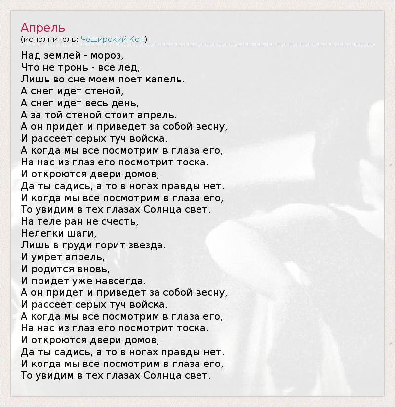 Над землей - мороз, Что не тронь - все лед, Лишь во сне моем поет капель. А снег идет стеной, А снег идет весь день, А за той стеной стоит апрель. А он придет и приведет за собой весну, И рассеет серых туч войска. А когда мы все посмотрим в глаза его, На нас из глаз его посмотрит тоска. И откроются двери домов, Да ты садись, а то в ногах правды нет. И когда мы все посмотрим в глаза его, То увидим в тех глазах Солнца свет. На теле ран не счесть, Нелегки шаги, Лишь в груди горит звезда. И умрет апрель, И родится вновь, И придет уже навсегда. А он придет и приведет за собой весну, И рассеет серых туч войска. А когда мы все посмотрим в глаза его, На нас из глаз его посмотрит тоска. И откроются двери домов, Да ты садись, а то в ногах правды нет. И когда мы все посмотрим в глаза его, То увидим в тех глазах Солнца свет.