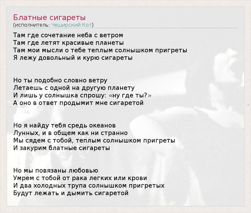 Там где сочетание неба с ветром Там где летят красивые планеты Там мои мысли о тебе теплым солнышком пригреты Я лежу довольный и курю сигареты Но ты подобно словно ветру Летаешь с одной на другую планету И лишь у солнышка спрошу: «ну где ты?» А оно в ответ продымит мне сигаретой Но я найду тебя средь океанов Лунных, и в общем как ни странно Мы сядем с тобой, теплым солнышком пригреты И закурим блатные сигареты Но мы повязаны любовью Умрем с тобой от рака легких или крови И два холодных трупа солнышком пригретых Будут лежать и дымить сигаретой