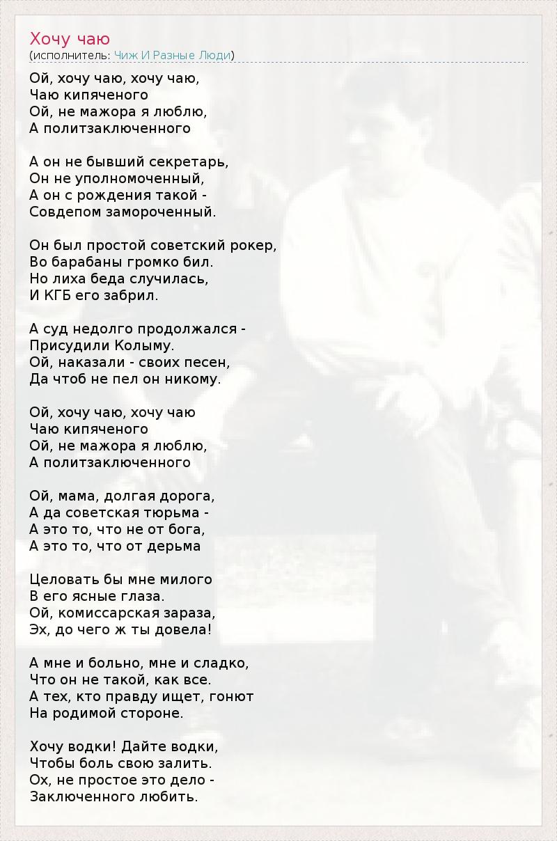 Ой, хочу чаю, хочу чаю, Чаю кипяченого Ой, не мажора я люблю, А политзаключенного А он не бывший секретарь, Он не уполномоченный, А он с рождения такой - Совдепом замороченный. Он был простой советский рокер, Во барабаны громко бил. Но лиха беда случилась, И КГБ его забрил. А суд недолго продолжался - Присудили Колыму. Ой, наказали - своих песен, Да чтоб не пел он никому. Ой, хочу чаю, хочу чаю Чаю кипяченого Ой, не мажора я люблю, А политзаключенного Ой, мама, долгая дорога, А да советская тюрьма - А это то, что не от бога, А это то, что от дерьма Целовать бы мне милого В его ясные глаза. Ой, комиссарская зараза, Эх, до чего ж ты довела! А мне и больно, мне и сладко, Что он не такой, как все. А тех, кто правду ищет, гонют На родимой стороне. Хочу водки! Дайте водки, Чтобы боль свою залить. Ох, не простое это дело - Заключенного любить.