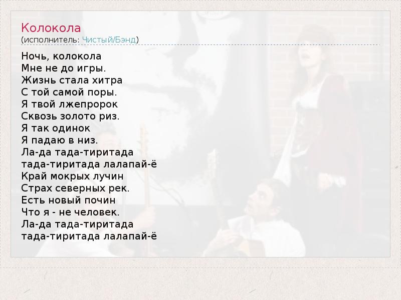 Ночь, колокола Мне не до игры. Жизнь стала хитра С той самой поры. Я твой лжепророк Сквозь золото риз. Я так одинок Я падаю в низ. Ла-да тада-тиритада тада-тиритада лалапай-ё Край мокрых лучин Страх северных рек. Есть новый почин Что я - не человек. Ла-да тада-тиритада тада-тиритада лалапай-ё