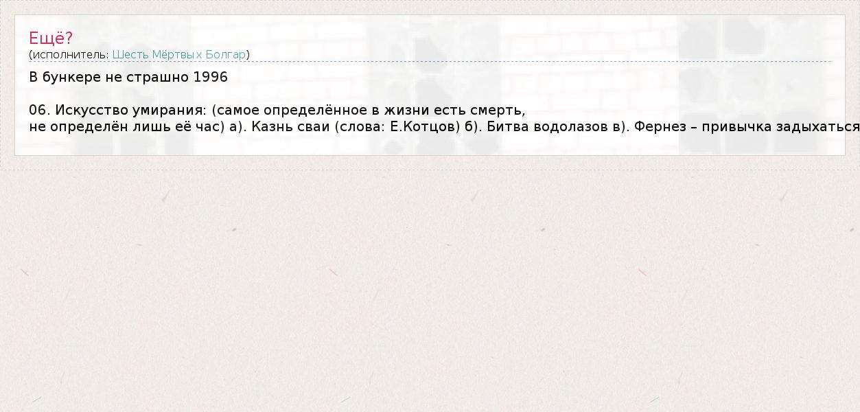 Это интересно:Шесть мёртвых болгар (6МБ) — легенда несуществующей российской индустриальной сцены из Архангельска. Только здесь могли появиться эти трое. Они не верят ни во что, кроме nois'а и candour! Они ищут гармонию в глубине собственной загрязненности, в современной социальной и политической ситуации в России — ситуации нетерпимости и издевательства над общественными ценностями и иллюзиями. "Marazm:a"... продолжение
