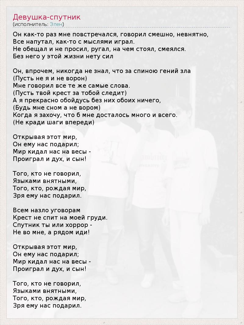 Он как-то раз мне повстречался, говорил смешно, невнятно, Все напутал, как-то с мыслями играл. Не обещал и не просил, ругал, на чем стоял, смеялся. Без него у этой жизни нету сил Он, впрочем, никогда не знал, что за спиною гений зла (Пусть не я и не ворон) Мне говорил все те же самые слова. (Пусть твой крест за тобой следит) А я прекрасно обойдусь без них обоих ничего, (Будь мне сном а не вором) Когда я захочу, что б мне досталось много и всего. (Не кради шаги впереди) Открывая этот мир, Он ему нас подарил; Мир кидал нас на весы - Проиграл и дух, и сын! Того, кто не говорил, Языками внятными, Того, кто, рождая мир, Зря ему нас подарил. Всем назло уговорам Крест не спит на моей груди. Спутник ты или хоррор - Не во мне, а рядом иди! Открывая этот мир, Он ему нас подарил; Мир кидал нас на весы - Проиграл и дух, и сын! Того, кто не говорил, Языками внятными, Того, кто, рождая мир, Зря ему нас подарил.