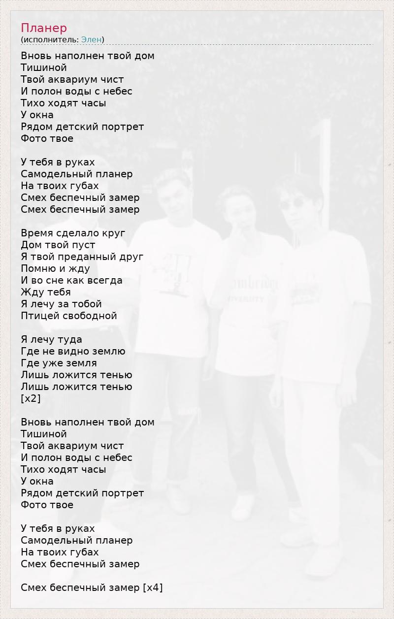 Вновь наполнен твой дом Тишиной Твой аквариум чист И полон воды с небес Тихо ходят часы У окна Рядом детский портрет Фото твое У тебя в руках Самодельный планер На твоих губах Смех беспечный замер Смех беспечный замер Время сделало круг Дом твой пуст Я твой преданный друг Помню и жду И во сне как всегда Жду тебя Я лечу за тобой Птицей свободной Я лечу туда Где не видно землю Где уже земля Лишь ложится тенью Лишь ложится тенью [х2] Вновь наполнен твой дом Тишиной Твой аквариум чист И полон воды с небес Тихо ходят часы У окна Рядом детский портрет Фото твое У тебя в руках Самодельный планер На твоих губах Смех беспечный замер Смех беспечный замер [x4]