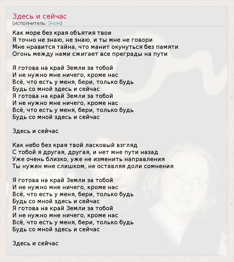 Как море без края объятия твои Я точно не знаю, не знаю, и ты мне не говори Мне нравится тайна, что манит окунуться без памяти Огонь между нами сжигает все преграды на пути Я готова на край Земли за тобой И не нужно мне ничего, кроме нас Всё, что есть у меня, бери, только будь Будь со мной здесь и сейчас Я готова на край Земли за тобой И не нужно мне ничего, кроме нас Всё, что есть у меня, бери, только будь Будь со мной здесь и сейчас Здесь и сейчас Как небо без края твой ласковый взгляд С тобой я другая, другая, и нет мне пути назад Уже очень близко, уже не изменить направления Ты нужен мне слишком, не оставляя доли сомнения Я готова на край Земли за тобой И не нужно мне ничего, кроме нас Всё, что есть у меня, бери, только будь Будь со мной здесь и сейчас Я готова на край Земли за тобой И не нужно мне ничего, кроме нас Всё, что есть у меня, бери, только будь Будь со мной здесь и сейчас Здесь и сейчас
