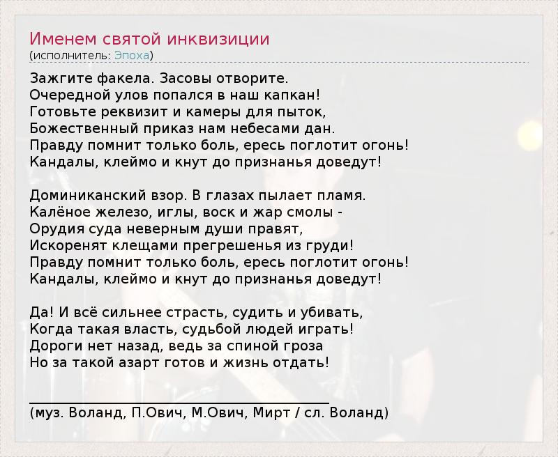 Зажгите факела. Засовы отворите. Очередной улов попался в наш капкан! Готовьте реквизит и камеры для пыток, Божественный приказ нам небесами дан. Правду помнит только боль, ересь поглотит огонь! Кандалы, клеймо и кнут до признанья доведут! Доминиканский взор. В глазах пылает пламя. Калёное железо, иглы, воск и жар смолы - Орудия суда неверным души правят, Искоренят клещами прегрешенья из груди! Правду помнит только боль, ересь поглотит огонь! Кандалы, клеймо и кнут до признанья доведут! Да! И всё сильнее страсть, судить и убивать, Когда такая власть, судьбой людей играть! Дороги нет назад, ведь за спиной гроза Но за такой азарт готов и жизнь отдать! ___________________________________________ (муз. Воланд, П.Ович, М.Ович, Мирт / сл. Воланд)