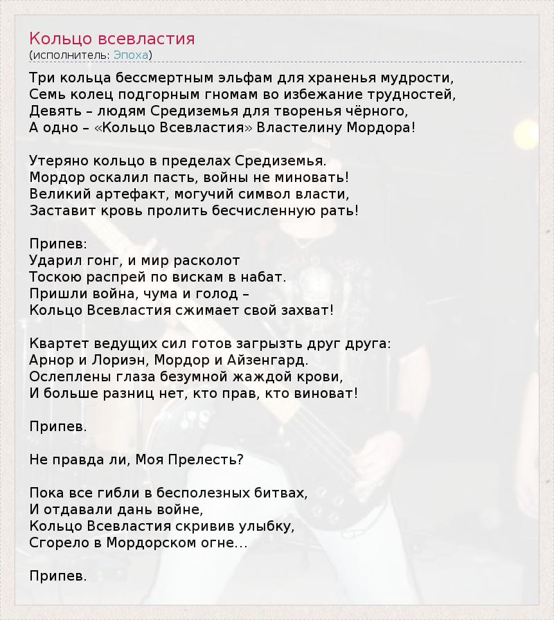 Три кольца бессмертным эльфам для храненья мудрости, Семь колец подгорным гномам во избежание трудностей, Девять – людям Средиземья для творенья чёрного, А одно – «Кольцо Всевластия» Властелину Мордора! Утеряно кольцо в пределах Средиземья. Мордор оскалил пасть, войны не миновать! Великий артефакт, могучий символ власти, Заставит кровь пролить бесчисленную рать! Припев: Ударил гонг, и мир расколот Тоскою распрей по вискам в набат. Пришли война, чума и голод – Кольцо Всевластия сжимает свой захват! Квартет ведущих сил готов загрызть друг друга: Арнор и Лориэн, Мордор и Айзенгард. Ослеплены глаза безумной жаждой крови, И больше разниц нет, кто прав, кто виноват! Припев. Не правда ли, Моя Прелесть? Пока все гибли в бесполезных битвах, И отдавали дань войне, Кольцо Всевластия скривив улыбку, Сгорело в Мордорском огне… Припев.