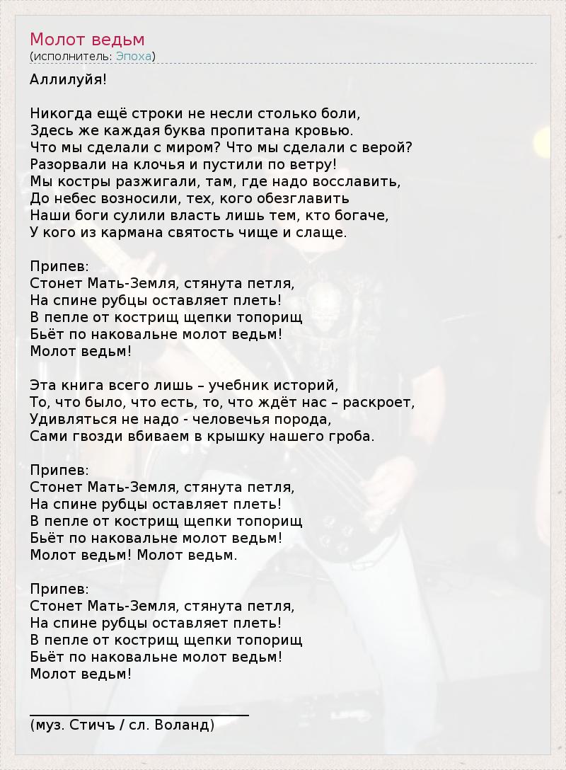 Аллилуйя! Никогда ещё строки не несли столько боли, Здесь же каждая буква пропитана кровью. Что мы сделали с миром? Что мы сделали с верой? Разорвали на клочья и пустили по ветру! Мы костры разжигали, там, где надо восславить, До небес возносили, тех, кого обезглавить Наши боги сулили власть лишь тем, кто богаче, У кого из кармана святость чище и слаще. Припев: Стонет Мать-Земля, стянута петля, На спине рубцы оставляет плеть! В пепле от кострищ щепки топорищ Бьёт по наковальне молот ведьм! Молот ведьм! Эта книга всего лишь – учебник историй, То, что было, что есть, то, что ждёт нас – раскроет, Удивляться не надо - человечья порода, Сами гвозди вбиваем в крышку нашего гроба. Припев: Стонет Мать-Земля, стянута петля, На спине рубцы оставляет плеть! В пепле от кострищ щепки топорищ Бьёт по наковальне молот ведьм! Молот ведьм! Молот ведьм. Припев: Стонет Мать-Земля, стянута петля, На спине рубцы оставляет плеть! В пепле от кострищ щепки топорищ Бьёт по наковальне молот ведьм! Молот ведьм! _______________________________ (муз. Стичъ / сл. Воланд)