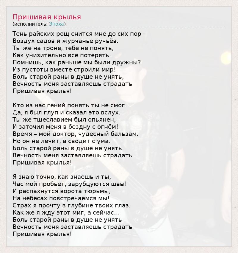 Тень райских рощ снится мне до сих пор - Воздух садов и журчанье ручьёв. Ты же на троне, тебе не понять, Как унизительно все потерять. Помнишь, как раньше мы были дружны? Из пустоты вместе строили мир! Боль старой раны в душе не унять, Вечность меня заставляешь страдать Пришивая крылья! Кто из нас гений понять ты не смог. Да, я был глуп и сказал это вслух. Ты же тщеславием был опьянен, И заточил меня в бездну с огнём! Время – мой доктор, чудесный бальзам. Но он не лечит, а сводит с ума. Боль старой раны в душе не унять Вечность меня заставляешь страдать Пришивая крылья! Я знаю точно, как знаешь и ты, Час мой пробьет, зарубцуются швы! И распахнутся ворота тюрьмы, На небесах повстречаемся мы! Страх я прочту в глубине твоих глаз. Как же я жду этот миг, а сейчас… Боль старой раны в душе не унять Вечность меня заставляешь страдать Пришивая крылья!
