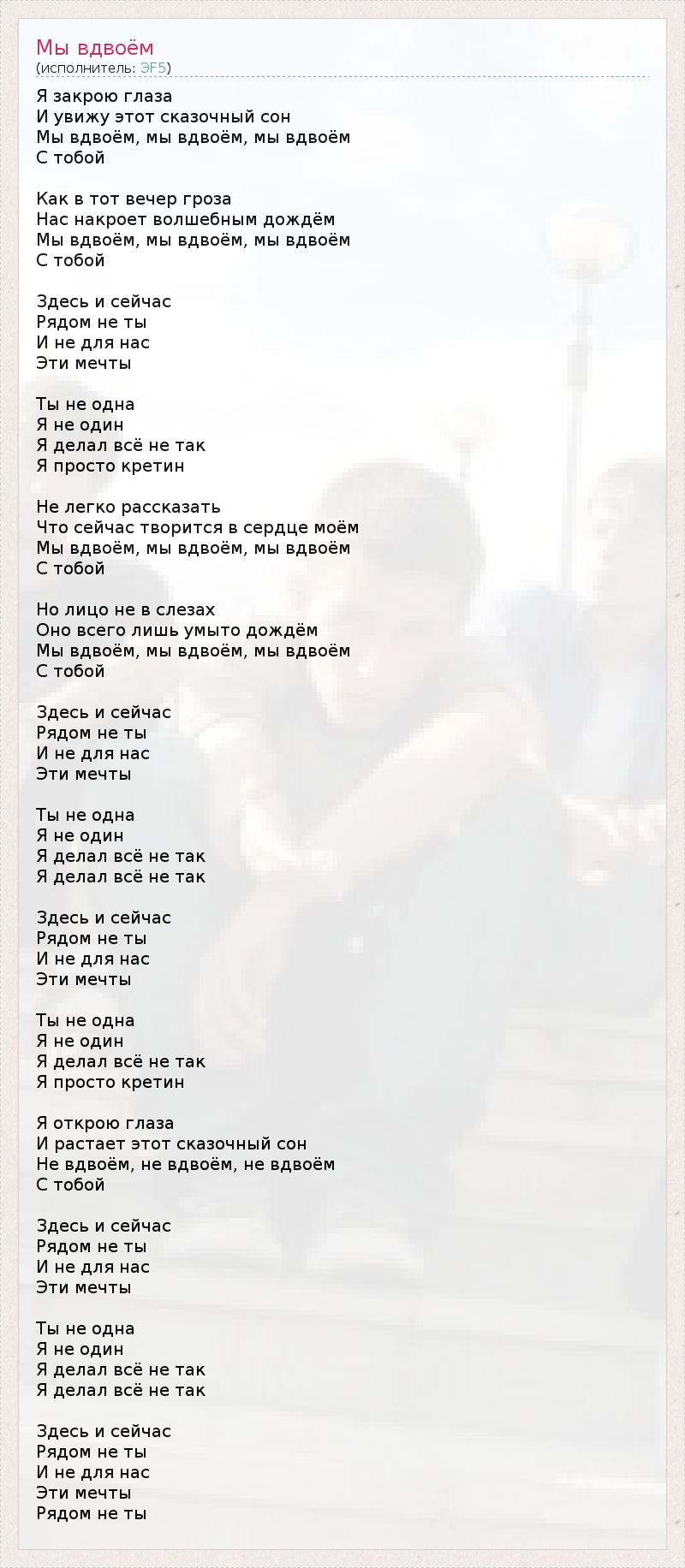 Я закрою глаза И увижу этот сказочный сон Мы вдвоём, мы вдвоём, мы вдвоём С тобой Как в тот вечер гроза Нас накроет волшебным дождём Мы вдвоём, мы вдвоём, мы вдвоём С тобой Здесь и сейчас Рядом не ты И не для нас Эти мечты Ты не одна Я не один Я делал всё не так Я просто кретин Не легко рассказать Что сейчас творится в сердце моём Мы вдвоём, мы вдвоём, мы вдвоём С тобой Но лицо не в слезах Оно всего лишь умыто дождём Мы вдвоём, мы вдвоём, мы вдвоём С тобой Здесь и сейчас Рядом не ты И не для нас Эти мечты Ты не одна Я не один Я делал всё не так Я делал всё не так Здесь и сейчас Рядом не ты И не для нас Эти мечты Ты не одна Я не один Я делал всё не так Я просто кретин Я открою глаза И растает этот сказочный сон Не вдвоём, не вдвоём, не вдвоём С тобой Здесь и сейчас Рядом не ты И не для нас Эти мечты Ты не одна Я не один Я делал всё не так Я делал всё не так Здесь и сейчас Рядом не ты И не для нас Эти мечты Рядом не ты