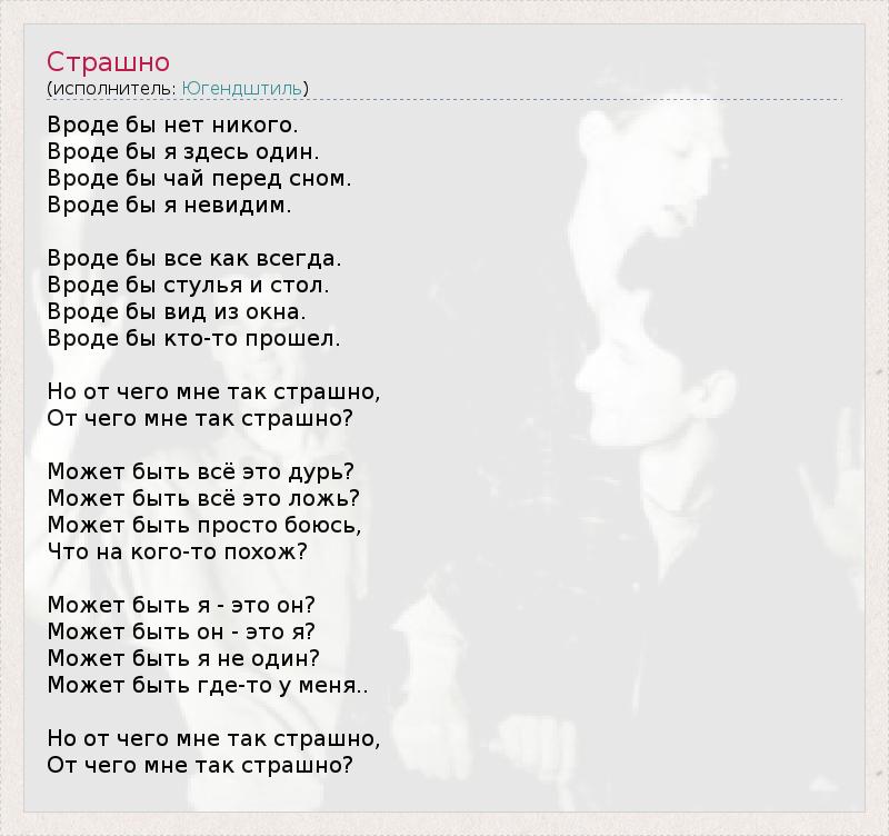 Вроде бы нет никого. Вроде бы я здесь один. Вроде бы чай перед сном. Вроде бы я невидим. Вроде бы все как всегда. Вроде бы стулья и стол. Вроде бы вид из окна. Вроде бы кто-то прошел. Но от чего мне так страшно, От чего мне так страшно? Может быть всё это дурь? Может быть всё это ложь? Может быть просто боюсь, Что на кого-то похож? Может быть я - это он? Может быть он - это я? Может быть я не один? Может быть где-то у меня.. Но от чего мне так страшно, От чего мне так страшно?
