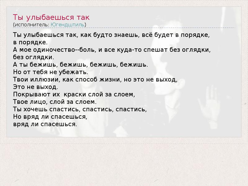 Ты улыбаешься так, как будто знаешь, всё будет в порядке, в порядке. А мое одиночество--боль, и все куда-то спешат без оглядки, без оглядки. А ты бежишь, бежишь, бежишь, бежишь. Но от тебя не убежать. Твои иллюзии, как способ жизни, но это не выход, Это не выход. Покрывают их краски слой за слоем, Твое лицо, слой за слоем. Ты хочешь спастись, спастись, спастись, Но вряд ли спасешься, вряд ли спасешься.
