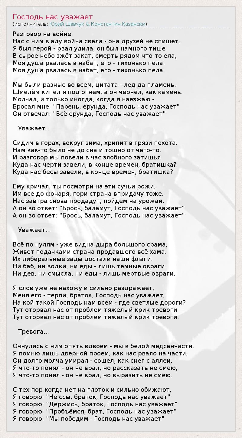 Разговор на войне Нас с ним в аду война свела - она друзей не спишет. Я был герой - рвал удила, он был намного тише В сырое небо зжёт закат, смерть рядом что-то ела, Моя душа рвалась в набат, его - тихонько пела. Моя душа рвалась в набат, его - тихонько пела. Мы были разные во всем, цитата - лед да пламень. Шмелём кипел я под огнем, а он чернел, как камень. Молчал, и только иногда, когда я наезжаю - Бросал мне: "Парень, ерунда, Господь нас уважает" Он отвечал: "Всё ерунда, Господь нас уважает" Уважает... Сидим в горах, вокруг зима, хрипит в грязи пехота. Нам как-то было не до сна и тошно от чего-то. И разговор мы повели в час злобного затишья Куда нас черти завели, в конце времен, братишка? Куда нас бесы завели, в конце времен, братишка? Ему кричал, ты посмотри на эти сучьи рожи, Им все до фонаря, гори страна впридачу тоже. Нас завтра снова продадут, пойдем на урожаи. А он во ответ: "Брось, баламут, Господь нас уважает" А он во ответ: "Брось, баламут, Господь нас уважает" Уважает... Всё по нулям - уже видна дыра большого срама, Живет подачками страна продавшего всё хама. Их либеральные зады достали наши флаги. Ни баб, ни водки, ни еды - лишь темные овраги. Ни дев, ни смысла, ни еды - лишь мертвые овраги. Я слов уже не нахожу и сильно раздражает, Меня его - терпи, браток, Господь нас уважает, На кой такой Господь нам всем - где светлые дороги? Тут оторвал нас от проблем тяжелый крик тревоги Тут оторвал нас от проблем тяжелый крик тревоги. Тревога... Очнулись с ним опять вдвоем - мы в белой медсанчасти. Я помню лишь дверной проем, как нас рвало на части, Он долго молча умирал - сошел, как снег с аллеи, Я что-то понял - он не врал, но рассказать не смею, Я что-то понял - он не врал, но выразить не смею. С тех пор когда нет на глоток и сильно обижают, Я говорю: "Не ссы, браток, Господь нас уважает" Я говорю: "Держись, браток, Господь нас уважает" Я говорю: "Пробъёмся, брат, Господь нас уважает" Я говорю: "Мы победим - Господь нас уважает"