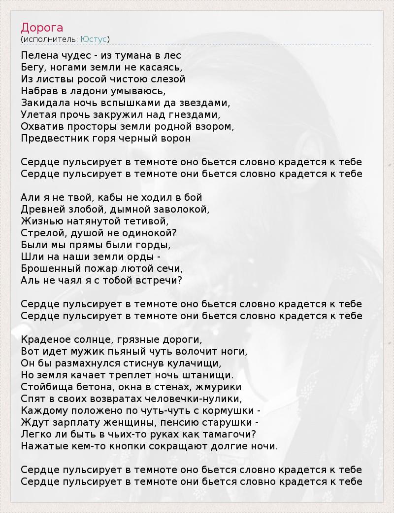 Пелена чудес - из тумана в лес Бегу, ногами земли не касаясь, Из листвы росой чистою слезой Набрав в ладони умываюсь, Закидала ночь вспышками да звездами, Улетая прочь закружил над гнездами, Охватив просторы земли родной взором, Предвестник горя черный ворон Сердце пульсирует в темноте оно бьется словно крадется к тебе Сердце пульсирует в темноте они бьется словно крадется к тебе Али я не твой, кабы не ходил в бой Древней злобой, дымной заволокой, Жизнью натянутой тетивой, Стрелой, душой не одинокой? Были мы прямы были горды, Шли на наши земли орды - Брошенный пожар лютой сечи, Аль не чаял я с тобой встречи? Сердце пульсирует в темноте оно бьется словно крадется к тебе Сердце пульсирует в темноте они бьется словно крадется к тебе Краденое солнце, грязные дороги, Вот идет мужик пьяный чуть волочит ноги, Он бы размахнулся стиснув кулачищи, Но земля качает треплет ночь штанищи. Стойбища бетона, окна в стенах, жмурики Спят в своих возвратах человечки-нулики, Каждому положено по чуть-чуть с кормушки - Ждут зарплату женщины, пенсию старушки - Легко ли быть в чьих-то руках как тамагочи? Нажатые кем-то кнопки сокращают долгие ночи. Сердце пульсирует в темноте оно бьется словно крадется к тебе Сердце пульсирует в темноте они бьется словно крадется к тебе