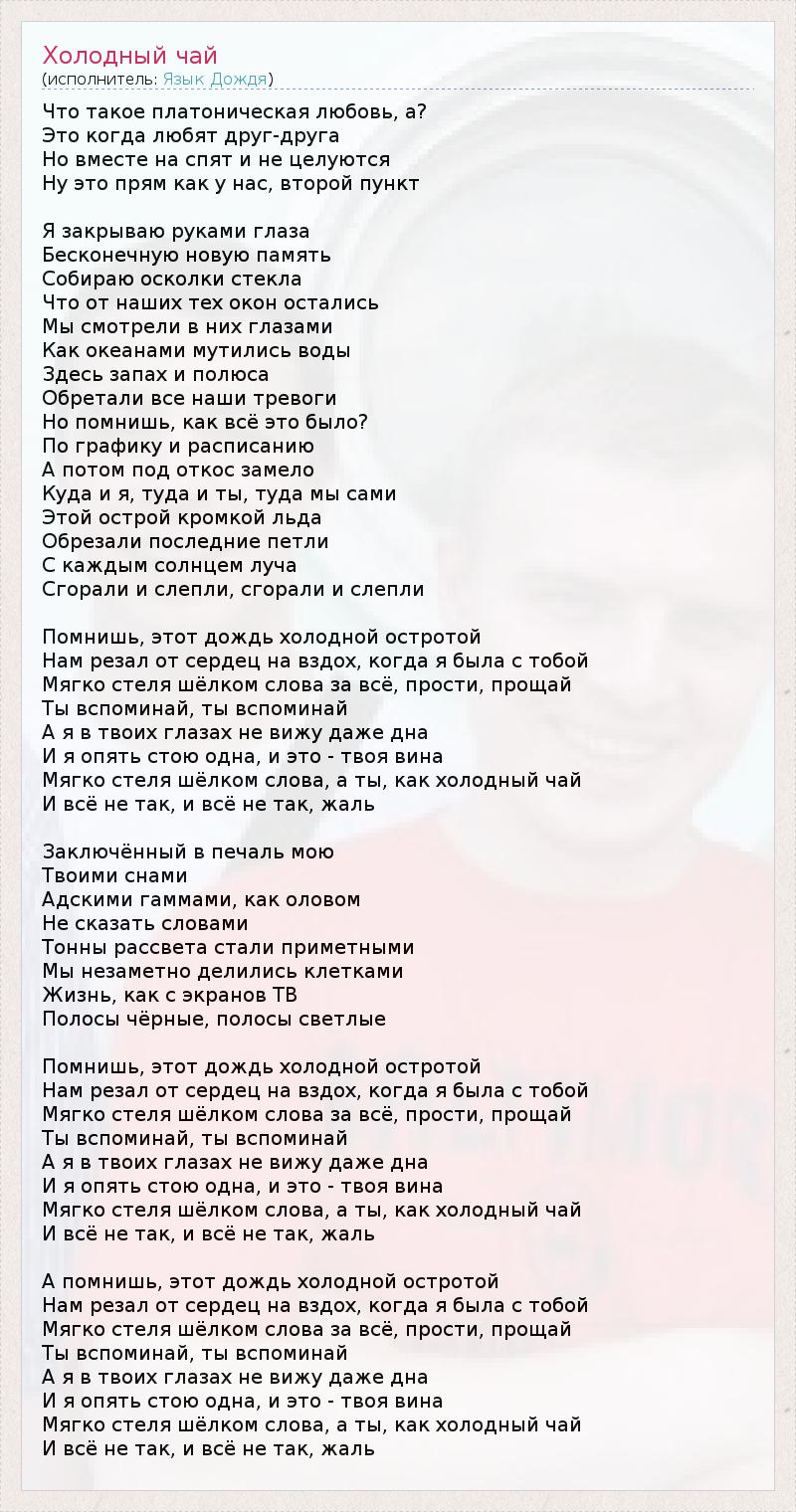 Что такое платоническая любовь, а? Это когда любят друг-друга Но вместе на спят и не целуются Ну это прям как у нас, второй пункт Я закрываю руками глаза Беcконечную новую память Собираю осколки стекла Что от наших тех окон остались Мы смотрели в них глазами Как океанами мутились воды Здесь запах и полюса Обретали все наши тревоги Но помнишь, как всё это было? По графику и расписанию А потом под откос замело Куда и я, туда и ты, туда мы сами Этой острой кромкой льда Обрезали последние петли С каждым солнцем луча Сгорали и слепли, сгорали и слепли Помнишь, этот дождь холодной остротой Нам резал от сердец на вздох, когда я была с тобой Мягко стеля шёлком слова за всё, прости, прощай Ты вспоминай, ты вспоминай А я в твоих глазах не вижу даже дна И я опять стою одна, и это - твоя вина Мягко стеля шёлком слова, а ты, как холодный чай И всё не так, и всё не так, жаль Заключённый в печаль мою Твоими снами Адскими гаммами, как оловом Не сказать словами Тонны рассвета стали приметными Мы незаметно делились клетками Жизнь, как с экранов ТВ Полосы чёрные, полосы светлые Помнишь, этот дождь холодной остротой Нам резал от сердец на вздох, когда я была с тобой Мягко стеля шёлком слова за всё, прости, прощай Ты вспоминай, ты вспоминай А я в твоих глазах не вижу даже дна И я опять стою одна, и это - твоя вина Мягко стеля шёлком слова, а ты, как холодный чай И всё не так, и всё не так, жаль А помнишь, этот дождь холодной остротой Нам резал от сердец на вздох, когда я была с тобой Мягко стеля шёлком слова за всё, прости, прощай Ты вспоминай, ты вспоминай А я в твоих глазах не вижу даже дна И я опять стою одна, и это - твоя вина Мягко стеля шёлком слова, а ты, как холодный чай И всё не так, и всё не так, жаль