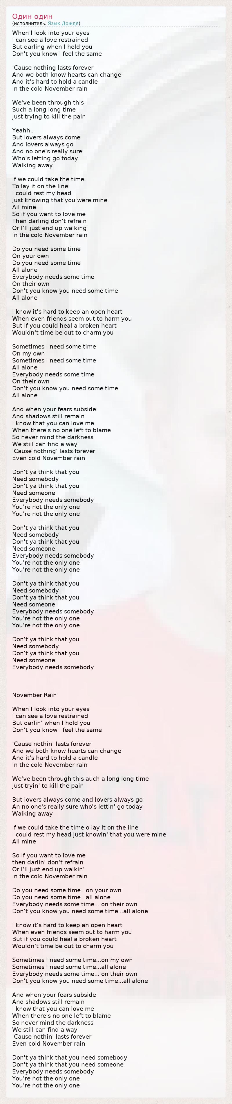 Когда я смотрю в твои глаза, Я вижу сдержанную любовь, Но, милая, когда я обнимаю тебя, Неужели ты не знаешь, что я чувствую то же? Ведь ничто не длится вечно, И мы оба знаем, что чувства могут измениться. И тяжело держать свечу Под холодным ноябрьским дождем. Мы прошли через это Долгое долгое время, Просто пытаясь убить боль. Да... Но влюбленные всегда встречаются И влюбленные всегда расстаются, И никто на самом деле не уверен, Кто кого отпускает сегодня Уйти навсегда... Если бы мы могли сделать паузу, Чтобы расставить все по своим местам, Я мог бы дать отдохнуть моей голове.... Просто зная, что ты - моя, Вся моя... Так что, если ты хочешь любить меня, Милая, не сдерживай свои чувства, Иначе я просто перестану идти вперед Под холодным ноябрьским дождем. Нужно ли тебе немного времени, Чтобы побыть с собой наедине? Нужно ли тебе немного времени, Чтобы побыть одной? Каждому нужно немного времени, Чтобы побыть с собой наедине.... Разве ты не знаешь - тебе надо немного времени, Чтобы побыть одной.... Я знаю - это трудно держать сердце открытым, Когда даже друзья, похоже, могут причинить боль, Но если бы ты смогла исцелить разбитое сердце, Неужели не было бы времени, чтобы очаровать тебя?... Иногда мне нужно немного времени, Чтобы побыть с собой наедине. Иногда мне нужно немного времени, Чтобы побыть одному. Каждому нужно немного времени, Чтобы побыть с собой наедине. Разве ты не знаешь - тебе надо немного времени, Чтобы побыть одной?... И когда твои страхи отступят, И тени все еще останутся, Я знаю, что ты можешь любить меня, Когда не останется никого, кого бы можно было винить... Так что не бери в голову темные мысли, Мы все еще можем найти путь, Ведь ничто не длится вечно, Даже холодный ноябрьский дождь... Не думаешь ли ты, что тебе Нужен кто-то? Не думаешь ли ты, что тебе Нужен кто-то? Каждому нужен кто-то, Ты не одинока в этом, Ты не одинока в этом.... Не думаешь ли ты, что тебе Нужен кто-то? Не думаешь ли ты, что тебе Нужен кто-то? Каждому нужен кто-то, Ты не одинока в этом, Ты не одинока в этом.... Не думаешь ли ты, что тебе Нужен кто-то? Не думаешь ли ты, что тебе Нужен кто-то? Каждому нужен кто-то, Ты не одинока в этом, Ты не одинока в этом.... Не думаешь ли ты, что тебе Нужен кто-то? Не думаешь ли ты, что тебе Нужен кто-то? Каждому нужен кто-то.... Ноябрьский дождь (перевод Элеоноры Федорович из Санкт-Петербурга) Я смотрю в твои глаза, Видя в них любовь твою. Тебя нужно удержать мне, Ведь я так тебя люблю. Но ничто не длится вечно – От судьбы ведь не уйдешь – Так же трудно жечь мне свечи В проливной ноябрьский дождь. Мы так долго шли сквозь муки, И убить пытались боль… Любовь к тебе пришла – она может уйти, Но никто её не сможет просто отпустить… Отпустить… Если б мы могли владеть судьбой своей, Ты могла б тогда остаться лишь моей, Лишь моей… Ведь ты меня так любишь – Любовь твоя – не ложь, И ты меня ждать будешь В проливной ноябрьский дождь. Ты привыкла быть влюблена И не сможешь быть ты одна. Каждый был хоть раз так влюблен, Но ведь одинок был и он. Казалось, что друзья вредят тебе – Так трудно жить с открытым сердцем: Хотят оставить след в твоей судьбе – Ты будешь жить с разбитым сердцем… И хоть теперь с тобой мы вольны, Но о прошлом нам снятся сны. Хоть, пробудившись, можем их забывать, Мы знаем, что мечты придут к нам опять… Пусть исчезнут твои страхи – Но вернется что-то вновь… Я знаю, что ты любиш