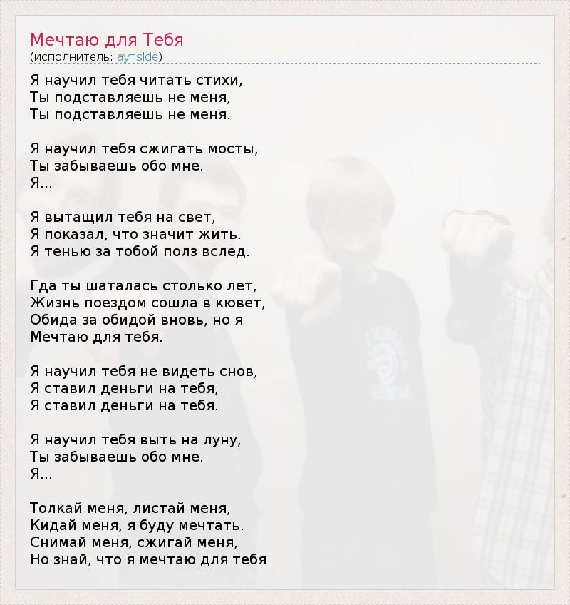 Я научил тебя читать стихи, Ты подставляешь не меня, Ты подставляешь не меня. Я научил тебя сжигать мосты, Ты забываешь обо мне. Я... Я вытащил тебя на свет, Я показал, что значит жить. Я тенью за тобой полз вслед. Гда ты шаталась столько лет, Жизнь поездом сошла в кювет, Обида за обидой вновь, но я Мечтаю для тебя. Я научил тебя не видеть снов, Я ставил деньги на тебя, Я ставил деньги на тебя. Я научил тебя выть на луну, Ты забываешь обо мне. Я... Толкай меня, листай меня, Кидай меня, я буду мечтать. Снимай меня, сжигай меня, Но знай, что я мечтаю для тебя