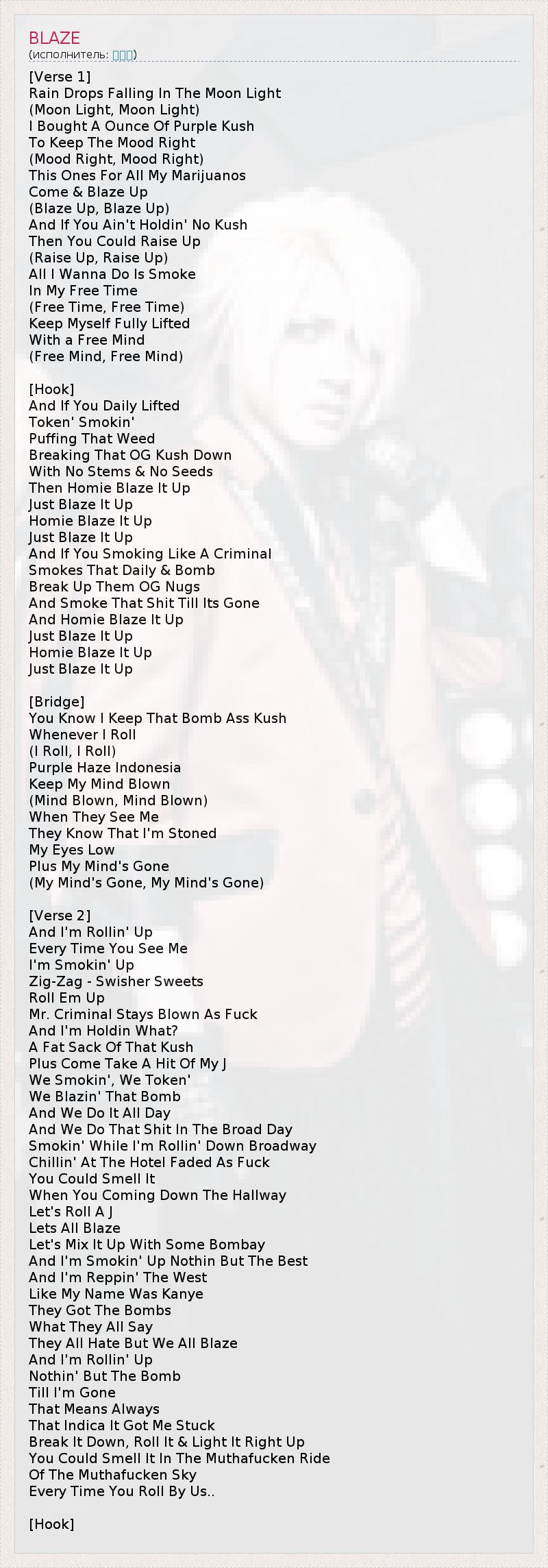 [Verse 1] Rain Drops Falling In The Moon Light (Moon Light, Moon Light) I Bought A Ounce Of Purple Kush To Keep The Mood Right (Mood Right, Mood Right) This Ones For All My Marijuanos Come & Blaze Up (Blaze Up, Blaze Up) And If You Ain't Holdin' No Kush Then You Could Raise Up (Raise Up, Raise Up) All I Wanna Do Is Smoke In My Free Time (Free Time, Free Time) Keep Myself Fully Lifted With a Free Mind (Free Mind, Free Mind) [Hook] And If You Daily Lifted Token' Smokin' Puffing That Weed Breaking That OG Kush Down With No Stems & No Seeds Then Homie Blaze It Up Just Blaze It Up Homie Blaze It Up Just Blaze It Up And If You Smoking Like A Criminal Smokes That Daily & Bomb Break Up Them OG Nugs And Smoke That Shit Till Its Gone And Homie Blaze It Up Just Blaze It Up Homie Blaze It Up Just Blaze It Up [Bridge] You Know I Keep That Bomb Ass Kush Whenever I Roll (I Roll, I Roll) Purple Haze Indonesia Keep My Mind Blown (Mind Blown, Mind Blown) When They See Me They Know That I'm Stoned My Eyes Low Plus My Mind's Gone (My Mind's Gone, My Mind's Gone) [Verse 2] And I'm Rollin' Up Every Time You See Me I'm Smokin' Up Zig-Zag - Swisher Sweets Roll Em Up Mr. Criminal Stays Blown As Fuck And I'm Holdin What? A Fat Sack Of That Kush Plus Come Take A Hit Of My J We Smokin', We Token' We Blazin' That Bomb And We Do It All Day And We Do That Shit In The Broad Day Smokin' While I'm Rollin' Down Broadway Chillin' At The Hotel Faded As Fuck You Could Smell It When You Coming Down The Hallway Let's Roll A J Lets All Blaze Let's Mix It Up With Some Bombay And I'm Smokin' Up Nothin But The Best And I'm Reppin' The West Like My Name Was Kanye They Got The Bombs What They All Say They All Hate But We All Blaze And I'm Rollin' Up Nothin' But The Bomb Till I'm Gone That Means Always That Indica It Got Me Stuck Break It Down, Roll It & Light It Right Up You Could Smell It In The Muthafucken Ride Of The Muthafucken Sky Every Time You Roll By Us.. [Hook]