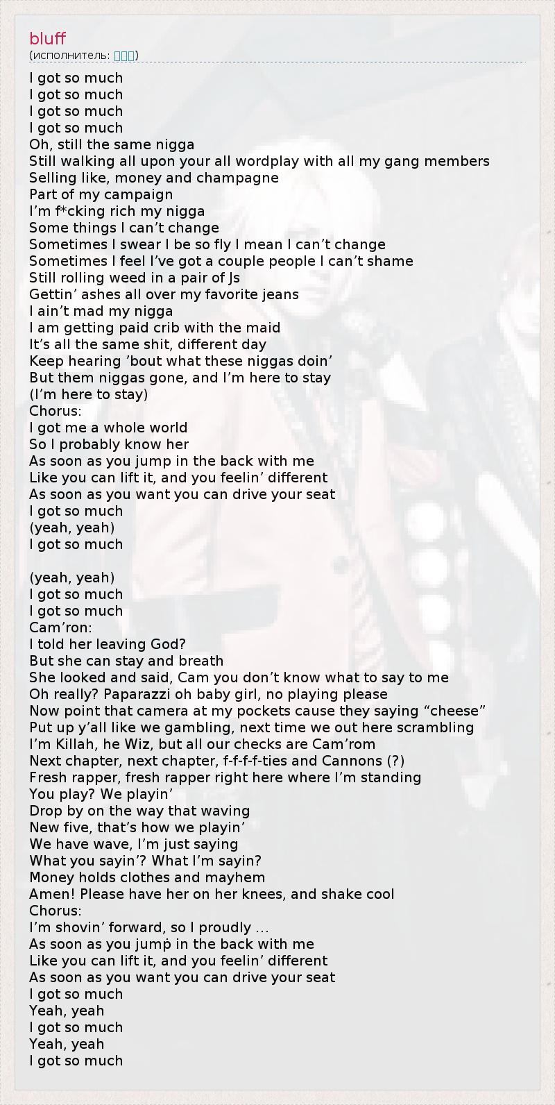 I got so much I got so much I got so much I got so much Oh, still the same nigga Still walking all upon your all wordplay with all my gang members Selling like, money and champagne Part of my campaign I’m f*cking rich my nigga Some things I can’t change Sometimes I swear I be so fly I mean I can’t change Sometimes I feel I’ve got a couple people I can’t shame Still rolling weed in a pair of Js Gettin’ ashes all over my favorite jeans I ain’t mad my nigga I am getting paid crib with the maid It’s all the same shit, different day Keep hearing ’bout what these niggas doin’ But them niggas gone, and I’m here to stay (I’m here to stay) Chorus: I got me a whole world So I probably know her As soon as you jump in the back with me Like you can lift it, and you feelin’ different As soon as you want you can drive your seat I got so much (yeah, yeah) I got so much (yeah, yeah) I got so much I got so much Cam’ron: I told her leaving God? But she can stay and breath She looked and said, Cam you don’t know what to say to me Oh really? Paparazzi oh baby girl, no playing please Now point that camera at my pockets cause they saying “cheese” Put up y’all like we gambling, next time we out here scrambling I’m Killah, he Wiz, but all our checks are Cam’rom Next chapter, next chapter, f-f-f-f-ties and Cannons (?) Fresh rapper, fresh rapper right here where I’m standing You play? We playin’ Drop by on the way that waving New five, that’s how we playin’ We have wave, I’m just saying What you sayin’? What I’m sayin? Money holds clothes and mayhem Amen! Please have her on her knees, and shake cool Chorus: I’m shovin’ forward, so I proudly … As soon as you jumṗ in the back with me Like you can lift it, and you feelin’ different As soon as you want you can drive your seat I got so much Yeah, yeah I got so much Yeah, yeah I got so much