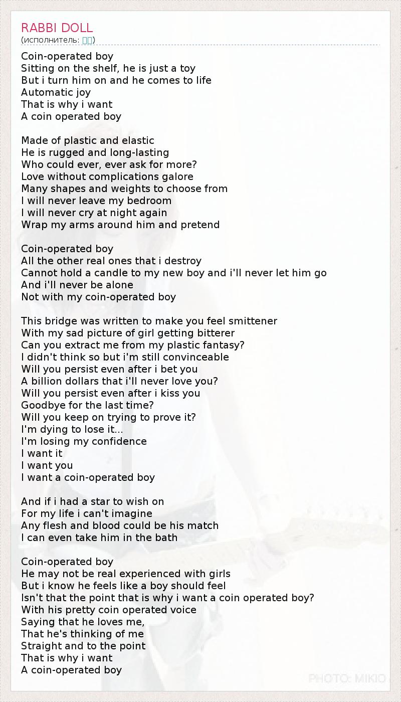 Coin-operated boy Sitting on the shelf, he is just a toy But i turn him on and he comes to life Automatic joy That is why i want A coin operated boy Made of plastic and elastic He is rugged and long-lasting Who could ever, ever ask for more? Love without complications galore Many shapes and weights to choose from I will never leave my bedroom I will never cry at night again Wrap my arms around him and pretend Coin-operated boy All the other real ones that i destroy Cannot hold a candle to my new boy and i'll never let him go And i'll never be alone Not with my coin-operated boy This bridge was written to make you feel smittener With my sad picture of girl getting bitterer Can you extract me from my plastic fantasy? I didn't think so but i'm still convinceable Will you persist even after i bet you A billion dollars that i'll never love you? Will you persist even after i kiss you Goodbye for the last time? Will you keep on trying to prove it? I'm dying to lose it... I'm losing my confidence I want it I want you I want a coin-operated boy And if i had a star to wish on For my life i can't imagine Any flesh and blood could be his match I can even take him in the bath Coin-operated boy He may not be real experienced with girls But i know he feels like a boy should feel Isn't that the point that is why i want a coin operated boy? With his pretty coin operated voice Saying that he loves me, That he's thinking of me Straight and to the point That is why i want A coin-operated boy