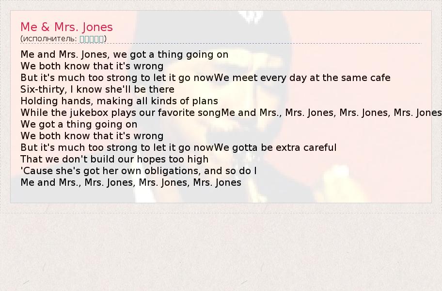 Me and Mrs., Mrs. Jones, Mrs. Jones, Mrs. Jones