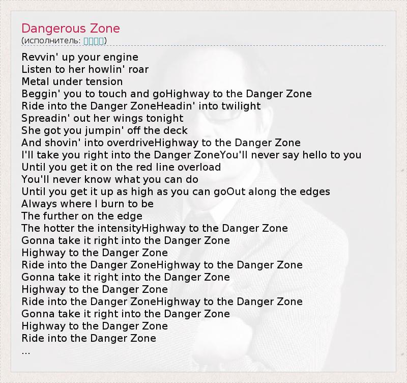Revvin' up your engine Listen to her howlin' roar Metal under tension Beggin' you to touch and goHighway to the Danger Zone Ride into the Danger ZoneHeadin' into twilight Spreadin' out her wings tonight She got you jumpin' off the deck And shovin' into overdriveHighway to the Danger Zone I'll take you right into the Danger ZoneYou'll never say hello to you Until you get it on the red line overload You'll never know what you can do Until you get it up as high as you can goOut along the edges Always where I burn to be The further on the edge The hotter the intensityHighway to the Danger Zone Gonna take it right into the Danger Zone Highway to the Danger Zone Ride into the Danger ZoneHighway to the Danger Zone Gonna take it right into the Danger Zone Highway to the Danger Zone Ride into the Danger ZoneHighway to the Danger Zone Gonna take it right into the Danger Zone Highway to the Danger Zone Ride into the Danger Zone ...