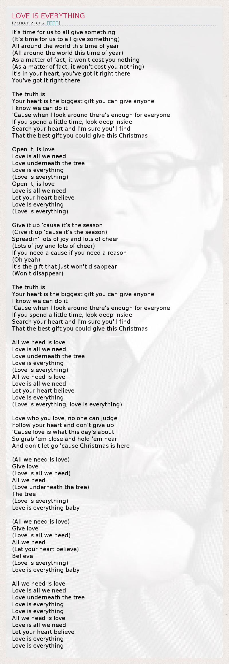 It's time for us to all give something (It's time for us to all give something) All around the world this time of year (All around the world this time of year) As a matter of fact, it won't cost you nothing (As a matter of fact, it won't cost you nothing) It's in your heart, you've got it right there You've got it right there The truth is Your heart is the biggest gift you can give anyone I know we can do it 'Cause when I look around there's enough for everyone If you spend a little time, look deep inside Search your heart and I'm sure you'll find That the best gift you could give this Christmas Open it, is love Love is all we need Love underneath the tree Love is everything (Love is everything) Open it, is love Love is all we need Let your heart believe Love is everything (Love is everything) Give it up 'cause it's the season (Give it up 'cause it's the season) Spreadin' lots of joy and lots of cheer (Lots of joy and lots of cheer) If you need a cause if you need a reason (Oh yeah) It's the gift that just won't disappear (Won't disappear) The truth is Your heart is the biggest gift you can give anyone I know we can do it 'Cause when I look around there's enough for everyone If you spend a little time, look deep inside Search your heart and I'm sure you'll find That the best gift you could give this Christmas All we need is love Love is all we need Love underneath the tree Love is everything (Love is everything) All we need is love Love is all we need Let your heart believe Love is everything (Love is everything, love is everything) Love who you love, no one can judge Follow your heart and don't give up 'Cause love is what this day's about So grab 'em close and hold 'em near And don't let go 'cause Christmas is here (All we need is love) Give love (Love is all we need) All we need (Love underneath the tree) The tree (Love is everything) Love is everything baby (All we need is love) Give love (Love is all we need) All we need (Let your heart believe) Believe (Love is everything) Love is everything baby All we need is love Love is all we need Love underneath the tree Love is everything Love is everything All we need is love Love is all we need Let your heart believe Love is everything Love is everything