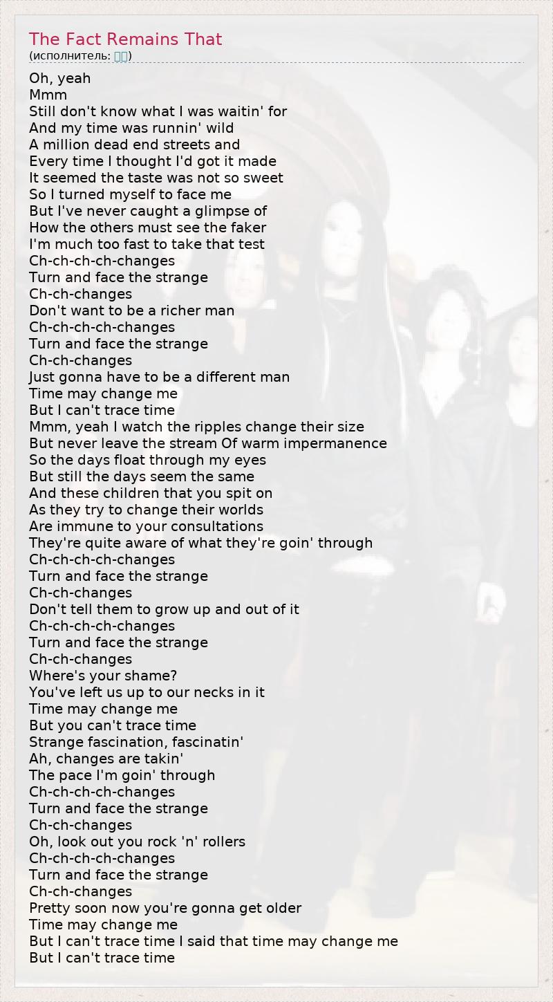 Oh, yeah Mmm Still don't know what I was waitin' for And my time was runnin' wild A million dead end streets and Every time I thought I'd got it made It seemed the taste was not so sweet So I turned myself to face me But I've never caught a glimpse of How the others must see the faker I'm much too fast to take that test Ch-ch-ch-ch-changes Turn and face the strange Ch-ch-changes Don't want to be a richer man Ch-ch-ch-ch-changes Turn and face the strange Ch-ch-changes Just gonna have to be a different man Time may change me But I can't trace time Mmm, yeah I watch the ripples change their size But never leave the stream Of warm impermanence So the days float through my eyes But still the days seem the same And these children that you spit on As they try to change their worlds Are immune to your consultations They're quite aware of what they're goin' through Ch-ch-ch-ch-changes Turn and face the strange Ch-ch-changes Don't tell them to grow up and out of it Ch-ch-ch-ch-changes Turn and face the strange Ch-ch-changes Where's your shame? You've left us up to our necks in it Time may change me But you can't trace time Strange fascination, fascinatin' Ah, changes are takin' The pace I'm goin' through Ch-ch-ch-ch-changes Turn and face the strange Ch-ch-changes Oh, look out you rock 'n' rollers Ch-ch-ch-ch-changes Turn and face the strange Ch-ch-changes Pretty soon now you're gonna get older Time may change me But I can't trace time I said that time may change me But I can't trace time