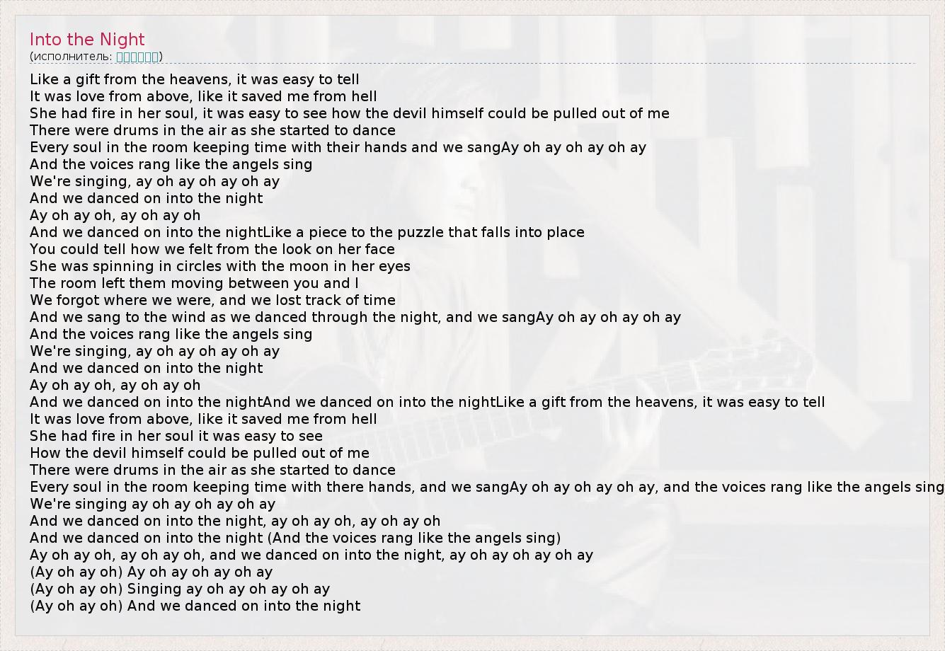 Like a gift from the heavens, it was easy to tell It was love from above, like it saved me from hell She had fire in her soul, it was easy to see how the devil himself could be pulled out of me There were drums in the air as she started to dance Every soul in the room keeping time with their hands and we sangAy oh ay oh ay oh ay And the voices rang like the angels sing We're singing, ay oh ay oh ay oh ay And we danced on into the night Ay oh ay oh, ay oh ay oh And we danced on into the nightLike a piece to the puzzle that falls into place You could tell how we felt from the look on her face She was spinning in circles with the moon in her eyes The room left them moving between you and I We forgot where we were, and we lost track of time And we sang to the wind as we danced through the night, and we sangAy oh ay oh ay oh ay And the voices rang like the angels sing We're singing, ay oh ay oh ay oh ay And we danced on into the night Ay oh ay oh, ay oh ay oh And we danced on into the nightAnd we danced on into the nightLike a gift from the heavens, it was easy to tell It was love from above, like it saved me from hell She had fire in her soul it was easy to see How the devil himself could be pulled out of me There were drums in the air as she started to dance Every soul in the room keeping time with there hands, and we sangAy oh ay oh ay oh ay, and the voices rang like the angels sing We're singing ay oh ay oh ay oh ay And we danced on into the night, ay oh ay oh, ay oh ay oh And we danced on into the night (And the voices rang like the angels sing) Ay oh ay oh, ay oh ay oh, and we danced on into the night, ay oh ay oh ay oh ay (Ay oh ay oh) Ay oh ay oh ay oh ay (Ay oh ay oh) Singing ay oh ay oh ay oh ay (Ay oh ay oh) And we danced on into the night