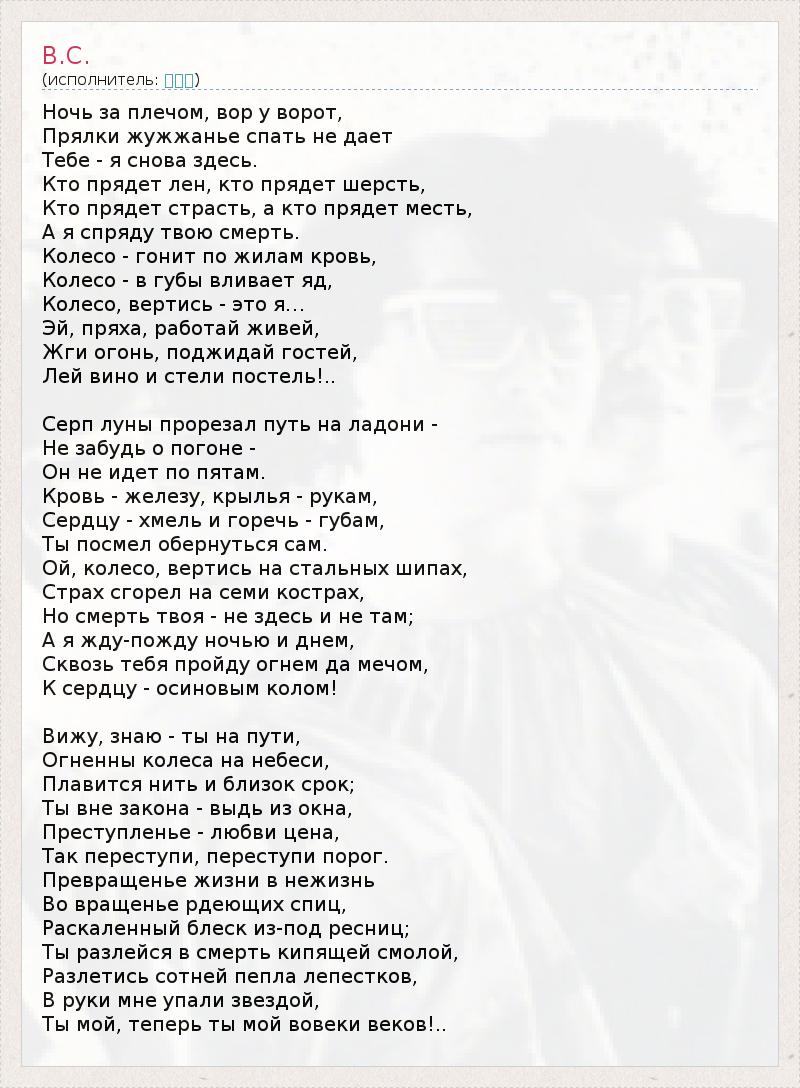 Ночь за плечом, вор у ворот, Прялки жужжанье спать не дает Тебе - я снова здесь. Кто прядет лен, кто прядет шерсть, Кто прядет страсть, а кто прядет месть, А я спряду твою смерть. Колесо - гонит по жилам кровь, Колесо - в губы вливает яд, Колесо, вертись - это я… Эй, пряха, работай живей, Жги огонь, поджидай гостей, Лей вино и стели постель!.. Серп луны прорезал путь на ладони - Не забудь о погоне - Он не идет по пятам. Кровь - железу, крылья - рукам, Сердцу - хмель и горечь - губам, Ты посмел обернуться сам. Ой, колесо, вертись на стальных шипах, Страх сгорел на семи кострах, Но смерть твоя - не здесь и не там; А я жду-пожду ночью и днем, Сквозь тебя пройду огнем да мечом, К сердцу - осиновым колом! Вижу, знаю - ты на пути, Огненны колеса на небеси, Плавится нить и близок срок; Ты вне закона - выдь из окна, Преступленье - любви цена, Так переступи, переступи порог. Превращенье жизни в нежизнь Во вращенье рдеющих спиц, Раскаленный блеск из-под ресниц; Ты разлейся в смерть кипящей смолой, Разлетись сотней пепла лепестков, В руки мне упали звездой, Ты мой, теперь ты мой вовеки веков!..