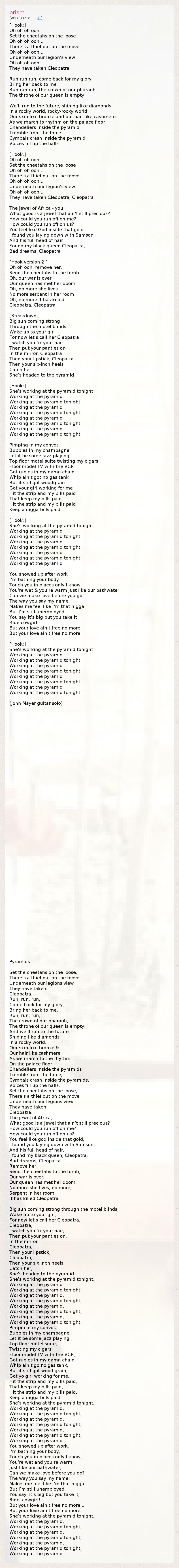 [Hook:] Oh oh oh ooh... Set the cheetahs on the loose Oh oh oh ooh... There's a thief out on the move Oh oh oh ooh... Underneath our legion's view Oh oh oh ooh... They have taken Cleopatra Run run run, come back for my glory Bring her back to me Run run run, the crown of our pharaoh The throne of our queen is empty We'll run to the future, shining like diamonds In a rocky world, rocky-rocky world Our skin like bronze and our hair like cashmere As we march to rhythm on the palace floor Chandeliers inside the pyramid, Tremble from the force Cymbals crash inside the pyramid, Voices fill up the halls [Hook:] Oh oh oh ooh... Set the cheetahs on the loose Oh oh oh ooh... There's a thief out on the move Oh oh oh ooh... Underneath our legion's view Oh oh oh ooh... They have taken Cleopatra, Cleopatra The jewel of Africa - you What good is a jewel that ain't still precious? How could you run off on me? How could you run off on us? You feel like God inside that gold I found you laying down with Samson And his full head of hair Found my black queen Cleopatra, Bad dreams, Cleopatra [Hook version 2:] Oh oh ooh, remove her, Send the cheetahs to the tomb Oh, our war is over, Our queen has met her doom Oh, no more she lives No more serpent in her room Oh, no more it has killed Cleopatra, Cleopatra [Breakdown:] Big sun coming strong Through the motel blinds Wake up to your girl For now let's call her Cleopatra I watch you fix your hair Then put your panties on In the mirror, Cleopatra Then your lipstick, Cleopatra Then your six-inch heels Catch her She's headed to the pyramid [Hook:] She's working at the pyramid tonight Working at the pyramid Working at the pyramid tonight Working at the pyramid Working at the pyramid tonight Working at the pyramid Working at the pyramid tonight Working at the pyramid Working at the pyramid tonight Pimping in my convos Bubbles in my champagne Let it be some jazz playing Top floor motel suite twisting my cigars Floor model TV with the VCR Got rubies in my damn chain Whip ain't got no gas tank But it still got woodgrain Got your girl working for me Hit the strip and my bills paid That keep my bills paid Hit the strip and my bills paid Keep a nigga bills paid [Hook:] She's working at the pyramid tonight Working at the pyramid Working at the pyramid tonight Working at the pyramid Working at the pyramid tonight Working at the pyramid Working at the pyramid tonight Working at the pyramid You showed up after work I'm bathing your body Touch you in places only I know You're wet & you're warm just like our bathwater Can we make love before you go The way you say my name Makes me feel like I'm that nigga But I'm still unemployed You say it's big but you take it Ride cowgirl But your love ain't free no more But your love ain't free no more [Hook:] She's working at the pyramid tonight Working at the pyramid Working at the pyramid tonight Working at the pyramid Working at the pyramid tonight Working at the pyramid Working at the pyramid tonight Working at the pyramid Working at the pyramid tonight (John Mayer guitar solo) Pyramids Set the cheetahs on the loose, There's a thief out on the move, Underneath our legions view They have taken Cleopatra. Run, run, run, Come back for my glory, Bring her back to me, Run, run, run, The crown of our pharaoh, The throne of our queen is empty. And we'll run to the future, Shining like diamonds In a rocky world. Our skin like bronze & Our hair like cashmere, As we march to the rhythm On the palace floor Chandeliers inside the pyramids Tremble from the force, Cymbals crash inside the pyramids, Voices fill up the halls. Set the cheetahs on the loose, There's a thief out on the move, Underneath our legions view They have taken Cleopatra. The jewel of Africa, What good is a jewel that ain't still precious? How could you run off on me? How could you run off on us? You feel like god inside that gold, I found you laying down with Samson, And his full head of hair. I found my black queen, Cleopatra, Bad dreams, Cleopatra. Remove her, Send the cheetahs to the tomb, Our war is over, Our queen has met her doom. No more she lives, no more, Serpent in her room, It has killed Cleopatra. Big sun coming strong through the motel blinds, Wake up to your girl, For now let's call her Cleopatra. Cleopatra, I watch you fix your hair, Then put your panties on, In the mirror, Cleopatra, Then your lipstick, Cleopatra, Then your six inch heels, Catch her, She's headed to the pyramid. She's working at the pyramid tonight, Working at the pyramid, Working at the pyramid tonight, Working at the pyramid, Working at the pyramid tonight, Working at the pyramid, Working at the pyramid tonight, Working at the pyramid, Working at the pyramid tonight. Pimpin in my convos, Bubbles in my champagne, Let it be some jazz playing, Top floor motel suite, Twisting my cigars, Floor model TV with the VCR, Got rubies in my damn chain, Whip ain't go no gas tank, But it still got wood grain, Got yo girl working for me, Hit the strip and my bills paid, That keep my bills paid, Hit the strip and my bills paid, Keep a nigga bills paid. She's working at the pyramid tonight, Working at the pyramid, Working at the pyramid tonight, Working at the pyramid, Working at the pyramid tonight, Working at the pyramid, Working at the pyramid tonight, Working at the pyramid. You showed up after work, I'm bathing your body, Touch you in places only I know, You're wet and you're warm, Just like our bathwater, Can we make love before you go? The way you say my name Makes me feel like I'm that nigga But I'm still unemployed. You say, it's big but you take it, Ride, cowgirl! But your love ain't free no more... But your love ain't free no more... She's working at the pyramid tonight, Working at the pyramid, Working at the pyramid tonight, Working at the pyramid, Working at the pyramid tonight, Working at the pyramid, Working at the pyramid tonight, Working at the pyramid.