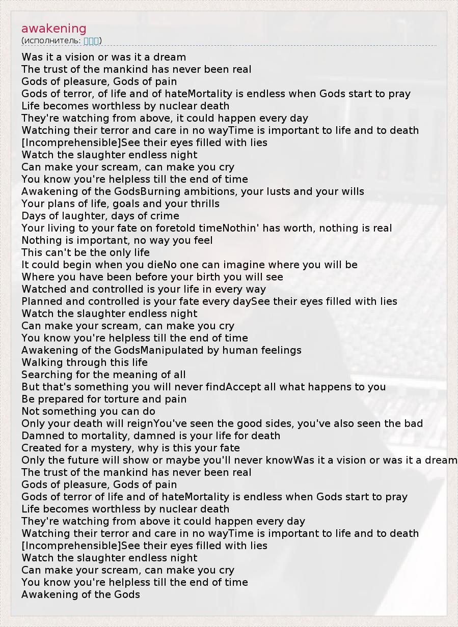 Was it a vision or was it a dream The trust of the mankind has never been real Gods of pleasure, Gods of pain Gods of terror, of life and of hateMortality is endless when Gods start to pray Life becomes worthless by nuclear death They're watching from above, it could happen every day Watching their terror and care in no wayTime is important to life and to death [Incomprehensible]See their eyes filled with lies Watch the slaughter endless night Can make your scream, can make you cry You know you're helpless till the end of time Awakening of the GodsBurning ambitions, your lusts and your wills Your plans of life, goals and your thrills Days of laughter, days of crime Your living to your fate on foretold timeNothin' has worth, nothing is real Nothing is important, no way you feel This can't be the only life It could begin when you dieNo one can imagine where you will be Where you have been before your birth you will see Watched and controlled is your life in every way Planned and controlled is your fate every daySee their eyes filled with lies Watch the slaughter endless night Can make your scream, can make you cry You know you're helpless till the end of time Awakening of the GodsManipulated by human feelings Walking through this life Searching for the meaning of all But that's something you will never findAccept all what happens to you Be prepared for torture and pain Not something you can do Only your death will reignYou've seen the good sides, you've also seen the bad Damned to mortality, damned is your life for death Created for a mystery, why is this your fate Only the future will show or maybe you'll never knowWas it a vision or was it a dream The trust of the mankind has never been real Gods of pleasure, Gods of pain Gods of terror of life and of hateMortality is endless when Gods start to pray Life becomes worthless by nuclear death They're watching from above it could happen every day Watching their terror and care in no wayTime is important to life and to death [Incomprehensible]See their eyes filled with lies Watch the slaughter endless night Can make your scream, can make you cry You know you're helpless till the end of time Awakening of the Gods