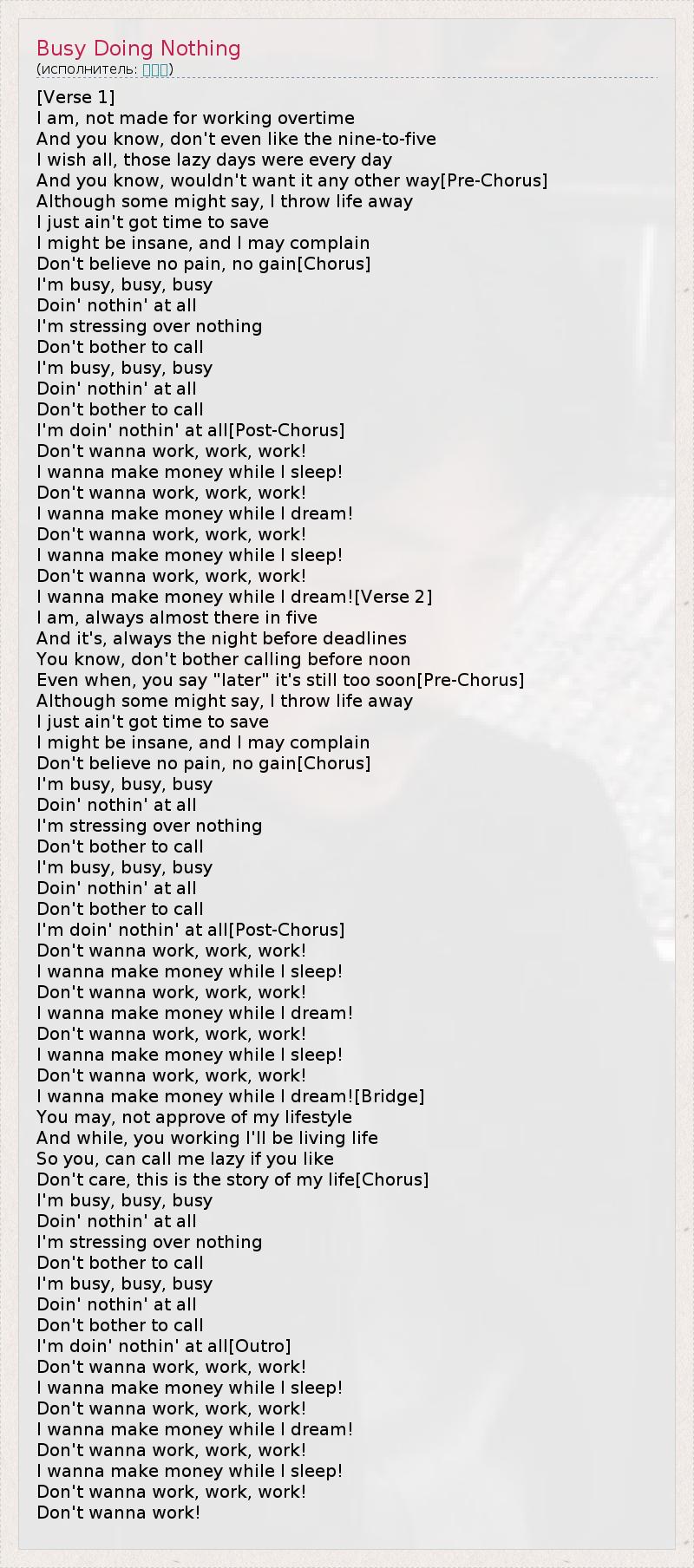 [Verse 1] I am, not made for working overtime And you know, don't even like the nine-to-five I wish all, those lazy days were every day And you know, wouldn't want it any other way[Pre-Chorus] Although some might say, I throw life away I just ain't got time to save I might be insane, and I may complain Don't believe no pain, no gain[Chorus] I'm busy, busy, busy Doin' nothin' at all I'm stressing over nothing Don't bother to call I'm busy, busy, busy Doin' nothin' at all Don't bother to call I'm doin' nothin' at all[Post-Chorus] Don't wanna work, work, work! I wanna make money while I sleep! Don't wanna work, work, work! I wanna make money while I dream! Don't wanna work, work, work! I wanna make money while I sleep! Don't wanna work, work, work! I wanna make money while I dream![Verse 2] I am, always almost there in five And it's, always the night before deadlines You know, don't bother calling before noon Even when, you say "later" it's still too soon[Pre-Chorus] Although some might say, I throw life away I just ain't got time to save I might be insane, and I may complain Don't believe no pain, no gain[Chorus] I'm busy, busy, busy Doin' nothin' at all I'm stressing over nothing Don't bother to call I'm busy, busy, busy Doin' nothin' at all Don't bother to call I'm doin' nothin' at all[Post-Chorus] Don't wanna work, work, work! I wanna make money while I sleep! Don't wanna work, work, work! I wanna make money while I dream! Don't wanna work, work, work! I wanna make money while I sleep! Don't wanna work, work, work! I wanna make money while I dream![Bridge] You may, not approve of my lifestyle And while, you working I'll be living life So you, can call me lazy if you like Don't care, this is the story of my life[Chorus] I'm busy, busy, busy Doin' nothin' at all I'm stressing over nothing Don't bother to call I'm busy, busy, busy Doin' nothin' at all Don't bother to call I'm doin' nothin' at all[Outro] Don't wanna work, work, work! I wanna make money while I sleep! Don't wanna work, work, work! I wanna make money while I dream! Don't wanna work, work, work! I wanna make money while I sleep! Don't wanna work, work, work! Don't wanna work!