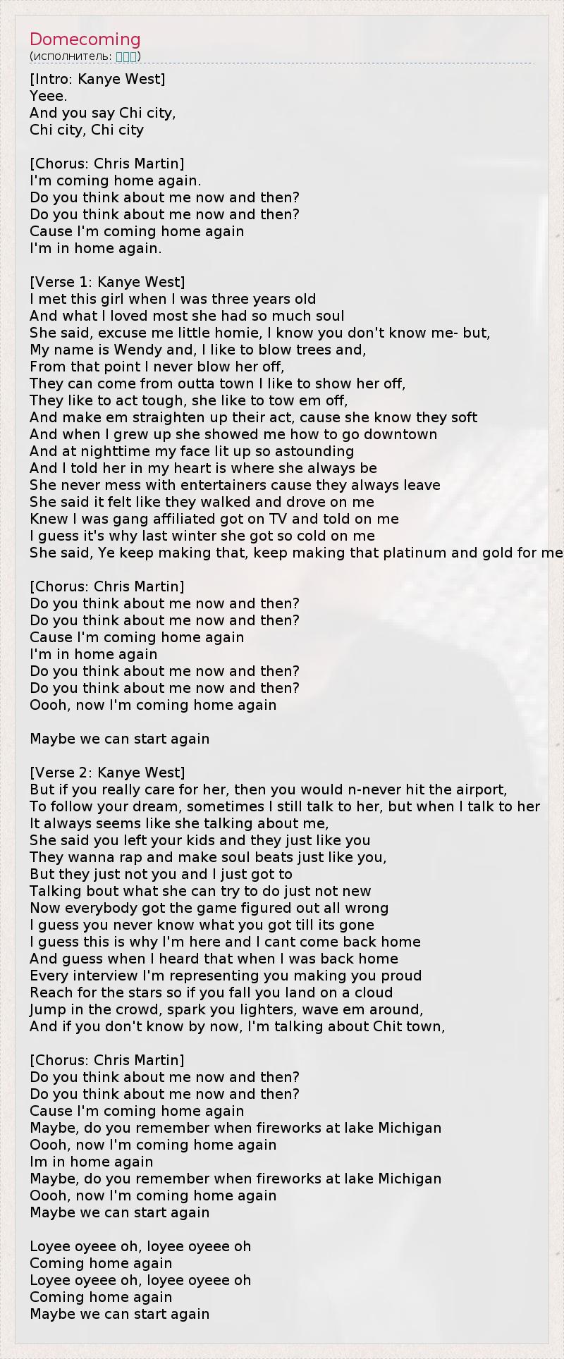 [Intro: Kanye West] Yeee. And you say Chi city, Chi city, Chi city [Chorus: Chris Martin] I'm coming home again. Do you think about me now and then? Do you think about me now and then? Cause I'm coming home again I'm in home again. [Verse 1: Kanye West] I met this girl when I was three years old And what I loved most she had so much soul She said, excuse me little homie, I know you don't know me- but, My name is Wendy and, I like to blow trees and, From that point I never blow her off, They can come from outta town I like to show her off, They like to act tough, she like to tow em off, And make em straighten up their act, cause she know they soft And when I grew up she showed me how to go downtown And at nighttime my face lit up so astounding And I told her in my heart is where she always be She never mess with entertainers cause they always leave She said it felt like they walked and drove on me Knew I was gang affiliated got on TV and told on me I guess it's why last winter she got so cold on me She said, Ye keep making that, keep making that platinum and gold for me [Chorus: Chris Martin] Do you think about me now and then? Do you think about me now and then? Cause I'm coming home again I'm in home again Do you think about me now and then? Do you think about me now and then? Oooh, now I'm coming home again Maybe we can start again [Verse 2: Kanye West] But if you really care for her, then you would n-never hit the airport, To follow your dream, sometimes I still talk to her, but when I talk to her It always seems like she talking about me, She said you left your kids and they just like you They wanna rap and make soul beats just like you, But they just not you and I just got to Talking bout what she can try to do just not new Now everybody got the game figured out all wrong I guess you never know what you got till its gone I guess this is why I'm here and I cant come back home And guess when I heard that when I was back home Every interview I'm representing you making you proud Reach for the stars so if you fall you land on a cloud Jump in the crowd, spark you lighters, wave em around, And if you don't know by now, I'm talking about Chit town, [Chorus: Chris Martin] Do you think about me now and then? Do you think about me now and then? Cause I'm coming home again Maybe, do you remember when fireworks at lake Michigan Oooh, now I'm coming home again Im in home again Maybe, do you remember when fireworks at lake Michigan Oooh, now I'm coming home again Maybe we can start again Loyee oyeee oh, loyee oyeee oh Coming home again Loyee oyeee oh, loyee oyeee oh Coming home again Maybe we can start again