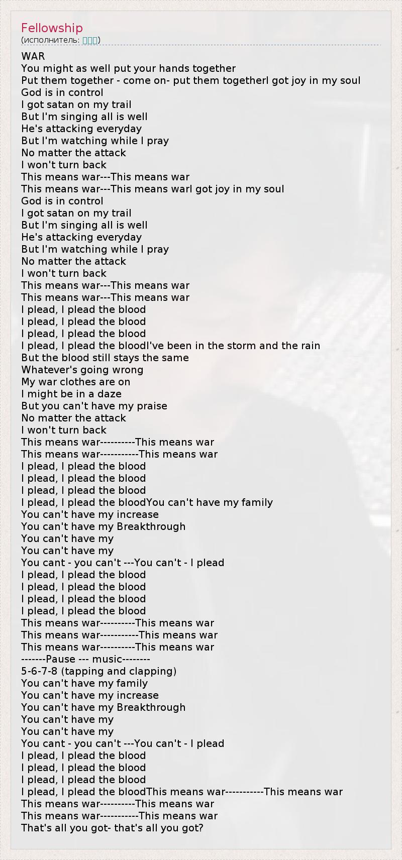 WAR You might as well put your hands together Put them together - come on- put them togetherI got joy in my soul God is in control I got satan on my trail But I'm singing all is well He's attacking everyday But I'm watching while I pray No matter the attack I won't turn back This means war---This means war This means war---This means warI got joy in my soul God is in control I got satan on my trail But I'm singing all is well He's attacking everyday But I'm watching while I pray No matter the attack I won't turn back This means war---This means war This means war---This means war I plead, I plead the blood I plead, I plead the blood I plead, I plead the blood I plead, I plead the bloodI've been in the storm and the rain But the blood still stays the same Whatever's going wrong My war clothes are on I might be in a daze But you can't have my praise No matter the attack I won't turn back This means war----------This means war This means war-----------This means war I plead, I plead the blood I plead, I plead the blood I plead, I plead the blood I plead, I plead the bloodYou can't have my family You can't have my increase You can't have my Breakthrough You can't have my You can't have my You cant - you can't ---You can't - I plead I plead, I plead the blood I plead, I plead the blood I plead, I plead the blood I plead, I plead the blood This means war----------This means war This means war-----------This means war This means war----------This means war -------Pause --- music-------- 5-6-7-8 (tapping and clapping) You can't have my family You can't have my increase You can't have my Breakthrough You can't have my You can't have my You cant - you can't ---You can't - I plead I plead, I plead the blood I plead, I plead the blood I plead, I plead the blood I plead, I plead the bloodThis means war-----------This means war This means war----------This means war This means war-----------This means war That's all you got- that's all you got?
