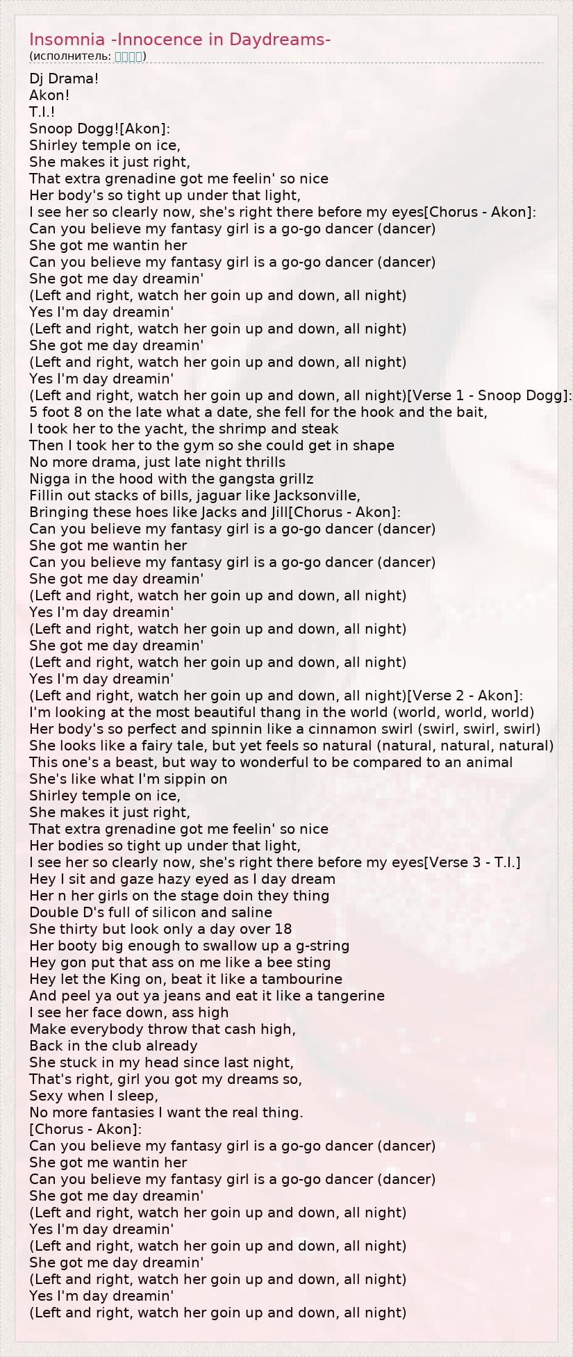 Dj Drama! Akon! T.I.! Snoop Dogg![Akon]: Shirley temple on ice, She makes it just right, That extra grenadine got me feelin' so nice Her body's so tight up under that light, I see her so clearly now, she's right there before my eyes[Chorus - Akon]: Can you believe my fantasy girl is a go-go dancer (dancer) She got me wantin her Can you believe my fantasy girl is a go-go dancer (dancer) She got me day dreamin' (Left and right, watch her goin up and down, all night) Yes I'm day dreamin' (Left and right, watch her goin up and down, all night) She got me day dreamin' (Left and right, watch her goin up and down, all night) Yes I'm day dreamin' (Left and right, watch her goin up and down, all night)[Verse 1 - Snoop Dogg]: 5 foot 8 on the late what a date, she fell for the hook and the bait, I took her to the yacht, the shrimp and steak Then I took her to the gym so she could get in shape No more drama, just late night thrills Nigga in the hood with the gangsta grillz Fillin out stacks of bills, jaguar like Jacksonville, Bringing these hoes like Jacks and Jill[Chorus - Akon]: Can you believe my fantasy girl is a go-go dancer (dancer) She got me wantin her Can you believe my fantasy girl is a go-go dancer (dancer) She got me day dreamin' (Left and right, watch her goin up and down, all night) Yes I'm day dreamin' (Left and right, watch her goin up and down, all night) She got me day dreamin' (Left and right, watch her goin up and down, all night) Yes I'm day dreamin' (Left and right, watch her goin up and down, all night)[Verse 2 - Akon]: I'm looking at the most beautiful thang in the world (world, world, world) Her body's so perfect and spinnin like a cinnamon swirl (swirl, swirl, swirl) She looks like a fairy tale, but yet feels so natural (natural, natural, natural) This one's a beast, but way to wonderful to be compared to an animal She's like what I'm sippin on Shirley temple on ice, She makes it just right, That extra grenadine got me feelin' so nice Her bodies so tight up under that light, I see her so clearly now, she's right there before my eyes[Verse 3 - T.I.] Hey I sit and gaze hazy eyed as I day dream Her n her girls on the stage doin they thing Double D's full of silicon and saline She thirty but look only a day over 18 Her booty big enough to swallow up a g-string Hey gon put that ass on me like a bee sting Hey let the King on, beat it like a tambourine And peel ya out ya jeans and eat it like a tangerine I see her face down, ass high Make everybody throw that cash high, Back in the club already She stuck in my head since last night, That's right, girl you got my dreams so, Sexy when I sleep, No more fantasies I want the real thing. [Chorus - Akon]: Can you believe my fantasy girl is a go-go dancer (dancer) She got me wantin her Can you believe my fantasy girl is a go-go dancer (dancer) She got me day dreamin' (Left and right, watch her goin up and down, all night) Yes I'm day dreamin' (Left and right, watch her goin up and down, all night) She got me day dreamin' (Left and right, watch her goin up and down, all night) Yes I'm day dreamin' (Left and right, watch her goin up and down, all night)