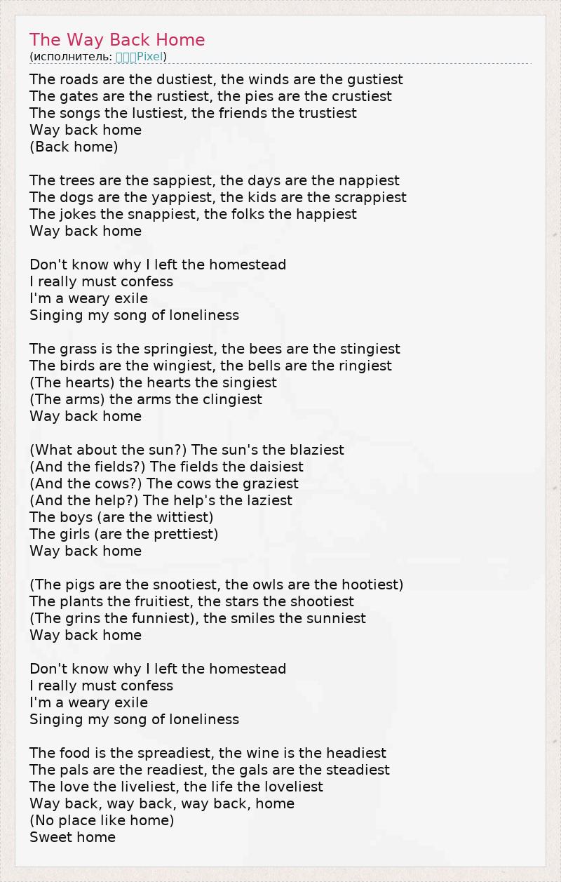 The roads are the dustiest, the winds are the gustiest The gates are the rustiest, the pies are the crustiest The songs the lustiest, the friends the trustiest Way back home (Back home) The trees are the sappiest, the days are the nappiest The dogs are the yappiest, the kids are the scrappiest The jokes the snappiest, the folks the happiest Way back home Don't know why I left the homestead I really must confess I'm a weary exile Singing my song of loneliness The grass is the springiest, the bees are the stingiest The birds are the wingiest, the bells are the ringiest (The hearts) the hearts the singiest (The arms) the arms the clingiest Way back home (What about the sun?) The sun's the blaziest (And the fields?) The fields the daisiest (And the cows?) The cows the graziest (And the help?) The help's the laziest The boys (are the wittiest) The girls (are the prettiest) Way back home (The pigs are the snootiest, the owls are the hootiest) The plants the fruitiest, the stars the shootiest (The grins the funniest), the smiles the sunniest Way back home Don't know why I left the homestead I really must confess I'm a weary exile Singing my song of loneliness The food is the spreadiest, the wine is the headiest The pals are the readiest, the gals are the steadiest The love the liveliest, the life the loveliest Way back, way back, way back, home (No place like home) Sweet home