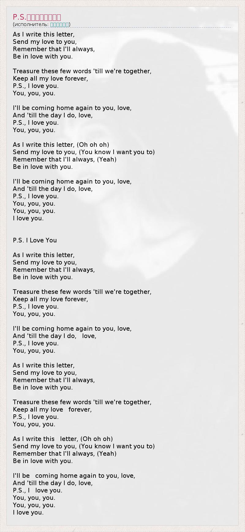 Когда я пишу это письмо, Я отправляю тебе свою любовь, Помни, что я всегда Буду любить тебя. Сбереги эти слова, пока не закончится разлука, Сохрани мою любовь навечно, P.S. Я люблю тебя. Тебя, тебя, тебя. Я снова вернусь к тебе, любовь моя, А пока не наступил этот день, я пишу: P.S. Я люблю тебя. Тебя, тебя, тебя. Когда я пишу это письмо (Ооо...) Я отправляю тебе свою любовь (Знаешь, я хочу, чтобы ты) Помнила, что я всегда (О, да) Буду любить тебя. Я снова вернусь к тебе, любовь моя, А пока не наступил этот день, я пишу, любимая, P.S. Я люблю тебя. Тебя, тебя, тебя. Тебя, тебя, тебя. Я люблю тебя. Приписка. Я люблю (Rust из Москва) Когда пишу письмо я, То шлю любовь мою, Запомни, дорогая, Я тебя люблю. Сохрани слова любви в разлуке, Моя любовь навеки. Приписка. Я люблю, Люблю, люблю, люблю. Я вернусь домой к тебе, родная, Пока ж я посылаю Приписку: "Я люблю, Люблю, люблю, люблю". Когда пишу письмо я, То шлю любовь мою, Запомни, дорогая, Я тебя люблю. Сохрани слова любви в разлуке, Моя любовь навеки. Приписка. Я люблю, Люблю, люблю, люблю. Когда пишу письмо я, (Ооо...) То шлю любовь мою, (И только умоляю) Запомни, дорогая,(Да-а!) Я тебя люблю. Я вернусь домой к тебе, родная, Пока ж я посылаю Приписку: "Я люблю, Люблю, люблю, люблю! Люблю, люблю, люблю! Я тебя люблю!".