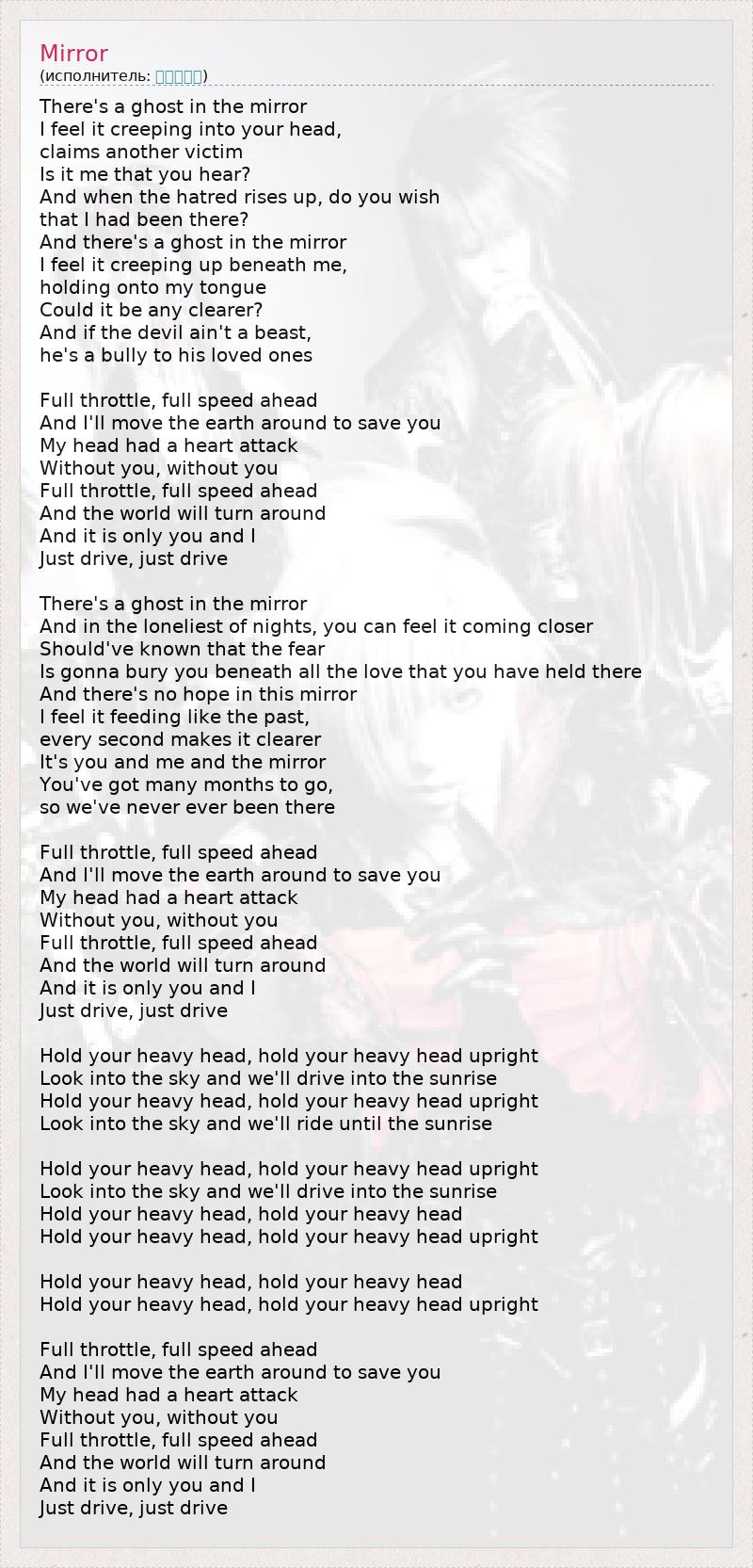 Там, в зеркале, есть призрак – Я чувствую, как он закрадывается в вашу голову, Требуя очередной жертвы. Я ли то, что ты слышишь? И когда твоя ненависть зашкаливает, желаешь ли ты, Чтобы я была там? И этот призрак в зеркале, Я чувствую, как он овладевает мной, Овладевает моим языком, Что может быть яснее? И если дьявол – не зверь, Он – обидчик своих возлюбленных. Газ в пол, полный вперёд, И я обогну всю землю, чтобы тебя спасти. У меня случился сердечный приступ 1 Без тебя, без тебя. Газ в пол, полный вперёд, И мир раскрутиться в обратную сторону, И это лишь ты и я, Просто гони, гони вперёд. Там, в зеркале, есть призрак – И самой одинокой ночью ты почувствуешь, что он всё ближе. Ты должен был знать, что страх Похоронит тебя подо всей этой любовью, что ты хранил, И там, в зеркале, нет никакой надежды. Я чувствую, как он насыщается, словно прошлое, С каждой секундой становясь всё очевиднее, Это лишь ты, я и зеркало – У тебя много месяцев впереди, чтобы уйти прочь, Так что мы там никогда в жизни не были. Газ в пол, полный вперёд, И я обогну всю землю, чтобы тебя спасти. У меня случился сердечный приступ Без тебя, без тебя. Газ в пол, полный вперёд, И мир раскрутиться в обратную сторону, И это лишь ты и я, Просто гони, гони вперёд. Не падай духом, не вешай нос, Смотри на небо, мы умчимся прямо в рассвет. Не падай духом, не вешай нос, Смотри на небо, мы будем гнать до самого рассвета. Не падай духом, не вешай нос, Смотри на небо, мы умчимся прямо в рассвет. Не падай духом, не вешай нос, Не падай духом, не вешай нос. Не падай духом, не вешай нос, Не падай духом, не вешай нос. Газ в пол, полный вперёд, И я обогну всю землю, чтобы тебя спасти. У меня случился сердечный приступ Без тебя, без тебя. Газ в пол, полный вперёд, И мир раскрутиться в обратную сторону, И это лишь ты и я, Просто гони, гони вперёд. 1 – досл.: Моя голова получила сердечный приступ.