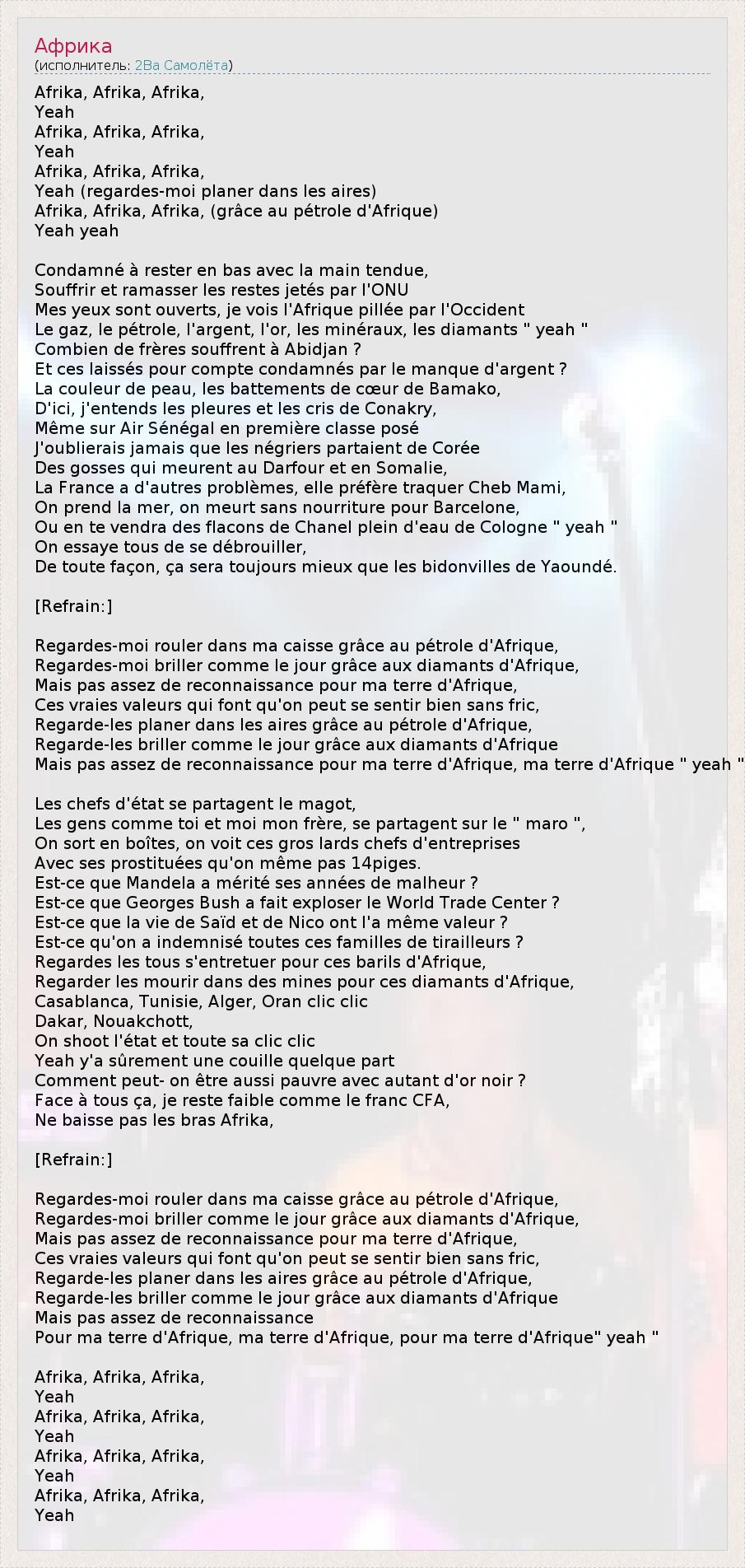 Pour ma terre d'Afrique, ma terre d'Afrique, pour ma terre d'Afrique" yeah "