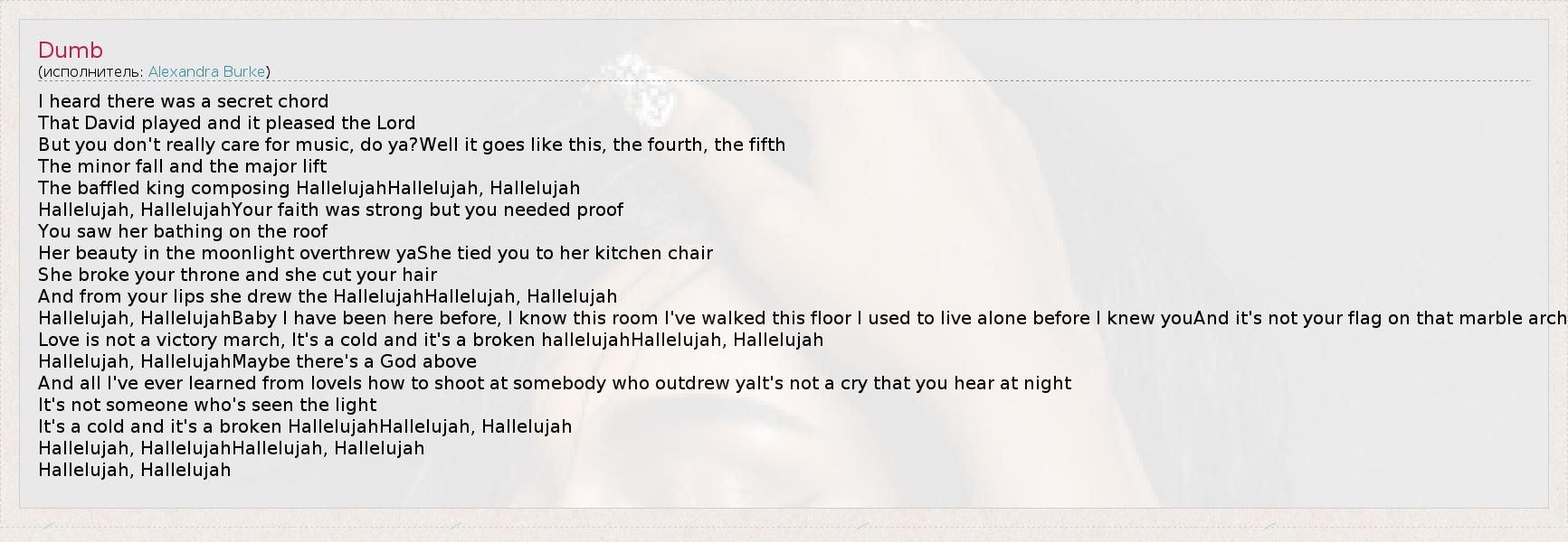 I heard there was a secret chord That David played and it pleased the Lord But you don't really care for music, do ya?Well it goes like this, the fourth, the fifth The minor fall and the major lift The baffled king composing HallelujahHallelujah, Hallelujah Hallelujah, HallelujahYour faith was strong but you needed proof You saw her bathing on the roof Her beauty in the moonlight overthrew yaShe tied you to her kitchen chair She broke your throne and she cut your hair And from your lips she drew the HallelujahHallelujah, Hallelujah Hallelujah, HallelujahBaby I have been here before, I know this room I've walked this floor I used to live alone before I knew youAnd it's not your flag on that marble arch Love is not a victory march, It's a cold and it's a broken hallelujahHallelujah, Hallelujah Hallelujah, HallelujahMaybe there's a God above And all I've ever learned from loveIs how to shoot at somebody who outdrew yaIt's not a cry that you hear at night It's not someone who's seen the light It's a cold and it's a broken HallelujahHallelujah, Hallelujah Hallelujah, HallelujahHallelujah, Hallelujah Hallelujah, Hallelujah