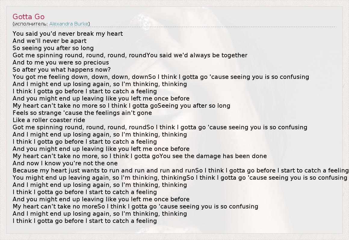 You said you'd never break my heart And we'll never be apart So seeing you after so long Got me spinning round, round, round, roundYou said we'd always be together And to me you were so precious So after you what happens now? You got me feeling down, down, down, downSo I think I gotta go 'cause seeing you is so confusing And I might end up losing again, so I'm thinking, thinking I think I gotta go before I start to catch a feeling And you might end up leaving like you left me once before My heart can't take no more so I think I gotta goSeeing you after so long Feels so strange 'cause the feelings ain't gone Like a roller coaster ride Got me spinning round, round, round, roundSo I think I gotta go 'cause seeing you is so confusing And I might end up losing again, so I'm thinking, thinking I think I gotta go before I start to catch a feeling And you might end up leaving like you left me once before My heart can't take no more, so I think I gotta goYou see the damage has been done And now I know you're not the one Because my heart just wants to run and run and run and runSo I think I gotta go before I start to catch a feeling You might end up leaving again, so I'm thinking, thinkingSo I think I gotta go 'cause seeing you is so confusing And I might end up losing again, so I'm thinking, thinking I think I gotta go before I start to catch a feeling And you might end up leaving like you left me once before My heart can't take no moreSo I think I gotta go 'cause seeing you is so confusing And I might end up losing again, so I'm thinking, thinking I think I gotta go before I start to catch a feeling