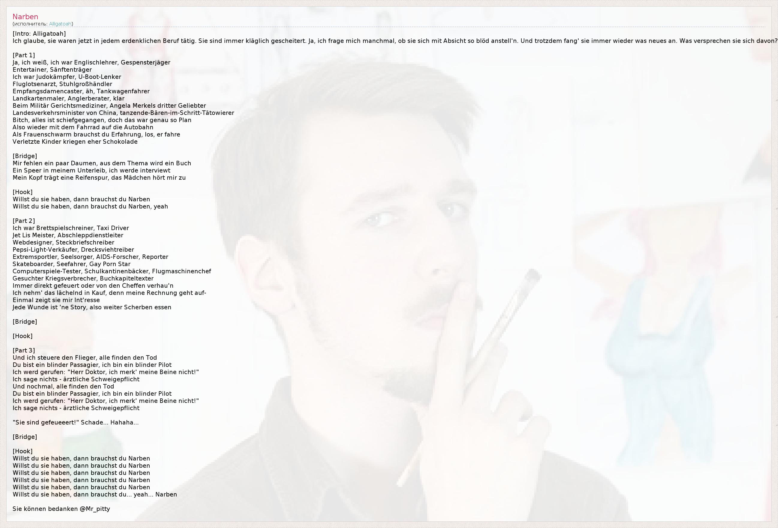 [Вступление: Alligatoah] Ich Glaube, Sie Варен Jetzt в Jedem erdenklichen Beruf tätig. Sie Синд Immer kläglich gescheitert. Ja, ич Frage Мичиган Manchmal, об-Sie Сич мит Absicht так blöd anstell'n. Und Trotzdem клык "Sie Immer Wieder был Neues ап. Был versprechen Sie Сич Davon? [Часть 1] Ja, ич Вайс, ич война Englischlehrer, Gespensterjäger Конферансье, Sänftenträger Ich войны Judokämpfer, U-Boot-Lenker Fluglotsenarzt, Stuhlgroßhändler Empfangsdamencaster, ах, Tankwagenfahrer Landkartenmaler, Anglerberater, прозрачное Байм Militär Gerichtsmediziner Ангела Merkels dritter Geliebter Landesverkehrsminister фон Китай, tanzende-Bären-им-Schritt-Tätowierer Сука, Alles IST schiefgegangen, Дочь дас война Genau так план Также Wieder мит дем Fahrrad Auf умереть Autobahn Альс Frauenschwarm brauchst дю Erfahrung, Лос-э-э Fähre Verletzte Киндер kriegen Eher Schokolade [Мост] Мир fehlen Эйн Paar Daumen, AUS DEM Thema Wird Эйн Бух Эйн Шпеер в meinem Unterleib, ич Werde interviewt Майн Копф trägt сделайте Reifenspur, дас Mädchen hört мир цу [Припев] Willst дю Sie Haben, Данн brauchst дю Narben Willst дю Sie Haben, Данн brauchst дю Narben, да [Часть 2] Ich войны Brettspielschreiner, Таксист Джет Лис Майстер, Abschleppdienstleiter Webdesigner, Steckbriefschreiber Пепси-Лайт-Verkäufer, Drecksviehtreiber Extremsportler, Seelsorger, СПИД-Forscher, Корреспондент Скейтбордист, Seefahrer, Гей порно звезда Computerspiele-тестер, Schulkantinenbäcker, Flugmaschinenchef Gesuchter Kriegsverbrecher, Buchkapiteltexter Immer директ gefeuert Одер фон ден Cheffen verhau'n Das Ich nehm 'lächelnd в KAUF, Denn Моя Rechnung Geht auf- Einmal zeigt Sie Мир Int'resse Jede Wunde IST 'пе история, также Weiter Scherben Эссен [Мост] [Припев] [Часть 3] Und Ich steuere ден Flieger, Все Финден ден Тод Ду БИСТ Эйн ослепления Passagier, ич бен Эйн ослепления пилота Ich ВЕРД gerufen: & Quot; герр доктор, ДМС Мерк "Моя Beine Nicht & Quot;! Ich мудрец Nichts - ärztliche Schweigepflicht Und nochmal, Все Финден ден Тод Ду БИСТ Эйн ослепления Passagier, ич бен Эйн ослепления пилота Ich ВЕРД gerufen: & Quot; герр доктор, ДМС Мерк "Моя Beine Nicht & Quot;! Ich мудрец Nichts - ärztliche Schweigepflicht & Quot; Sie Синд gefeueeert & Quot!; Шаде ... Хахаха ... [Мост] [Припев] Willst дю Sie Haben, Данн brauchst дю Narben Willst дю Sie Haben, Данн brauchst дю Narben Willst дю Sie Haben, Данн brauchst дю Narben Willst дю Sie Haben, Данн brauchst дю Narben Willst дю Sie Haben, Данн brauchst дю Narben Willst дю Sie Haben, Данн brauchst дю ... да ... Narben Sie können bedankenMr_pitty