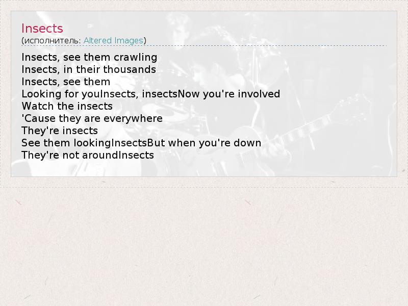 Это интересно:ОЛТЕРД ИМИДЖИЗ (Altered Images) - шотландский поп-квартет во главе с певицей Клэр Гроган, чей детский лик и хрупкий голосок в начале 1980-х годов привлек внимание утомленной панк-роком публики.ALTERED IMAGES собрались в одной из школ Глазго осенью 1977 в составе: Тони Макдэйд (Tony McDaid; гитара, бас), братья Джерри Макилхон (Gerry McElhone; ритм-гитара) и Джонни Макилхон (Johnny McElhone; бас, гитара) и, наконец, Майкл «Тик»... продолжение