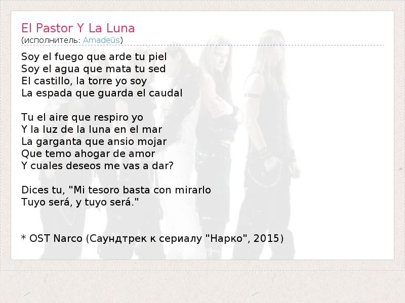 Soy el fuego que arde tu piel Soy el agua que mata tu sed El castillo, la torre yo soy La espada que guarda el caudal Tu el aire que respiro yo Y la luz de la luna en el mar La garganta que ansio mojar Que temo ahogar de amor Y cuales deseos me vas a dar? Dices tu, "Mi tesoro basta con mirarlo Tuyo será, y tuyo será." * OST Narco (Саундтрек к сериалу "Нарко", 2015)