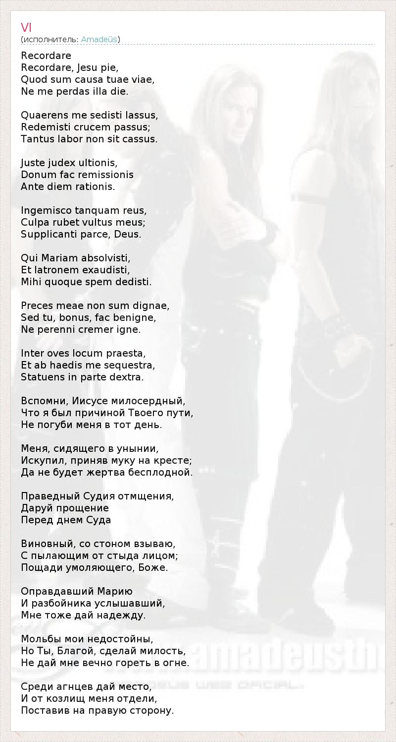 Recordare Recordare, Jesu pie, Quod sum causa tuae viae, Ne me perdas illa die. Quaerens me sedisti lassus, Redemisti crucem passus; Tantus labor non sit cassus. Juste judex ultionis, Donum fac remissionis Ante diem rationis. Ingemisco tanquam reus, Culpa rubet vultus meus; Supplicanti parce, Deus. Qui Mariam absolvisti, Et latronem exaudisti, Mihi quoque spem dedisti. Preces meae non sum dignae, Sed tu, bonus, fac benigne, Ne perenni cremer igne. Inter oves locum praesta, Et ab haedis me sequestra, Statuens in parte dextra. Вспомни, Иисусе милосердный, Что я был причиной Твоего пути, Не погуби меня в тот день. Меня, сидящего в унынии, Искупил, приняв муку на кресте; Да не будет жертва бесплодной. Праведный Судия отмщения, Даруй прощение Перед днем Суда Виновный, со стоном взываю, С пылающим от стыда лицом; Пощади умоляющего, Боже. Оправдавший Марию И разбойника услышавший, Мне тоже дай надежду. Мольбы мои недостойны, Но Ты, Благой, сделай милость, Не дай мне вечно гореть в огне. Среди агнцев дай место, И от козлищ меня отдели, Поставив на правую сторону.